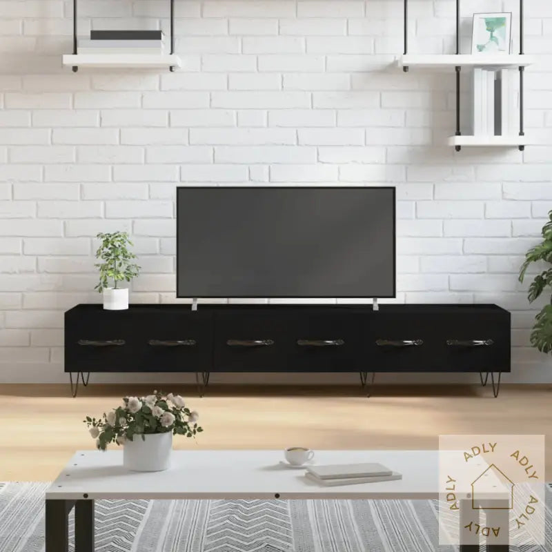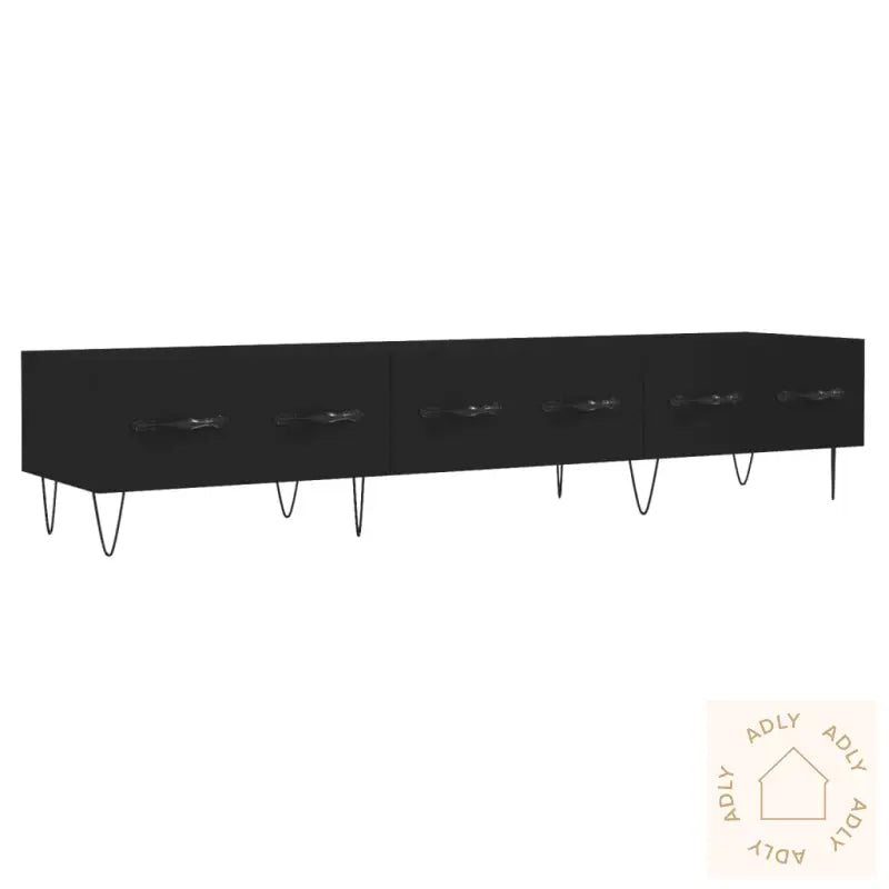 Solid materiale: Konstruert tre gir ikke bare en glatt og elegant overflate, det har også høy kvalitet med god styrke, stabilitet og motstand mot fukt. Denne TV-benken krever lite vedlikehold og er superenkel å tørke av, noe som gjør den ideell for travle hjem.Romslig oppbevaring: De tre skuffene gir deg masse plass til å organisere alt fra magasiner og DVD-er til fjernkontroller og andre nødvendigheter, slik at du kan holde stua ryddig og oversiktlig.Visningsfunksjon: Den solide toppen gir rikelig med plass til å vise frem favorittdekor, som bilder, planter eller pyntegjenstander. Dette lar deg sette et personlig preg på interiøret sammen med øvrige møbler.Jernben: De stilige jernbena tilfører både sjarme og et coselig uttrykk til hjemmet ditt, samtidig som de sørger for at TV-benken står stødig og har lang levetid.Farge: svartMaterialer: konstruert tre, jernMål: 150 x 36 x 30 cm (B x D x H)Montering kreves: ja