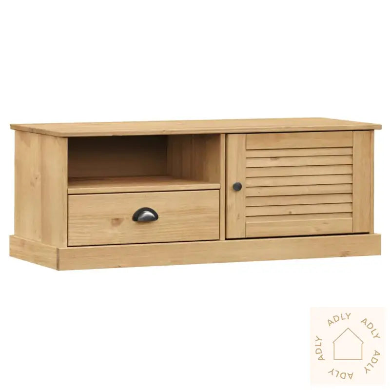 Heltre furu: TV-benken er laget av solid heltre furu, et naturlig materiale som både ser flott ut og har høy slitestyrke. Furuens rette årringer og tydelige kvister gir møbelet et unikt, rustikt preg, samtidig som det gjør at hvert produkt får sitt eget særpreg. Dette gir benken en varm og innbydende følelse som passer ypperlig sammen med andre møbler til hjemmet eller hagemøbler.Rikelig med lagringsplass: TV-benken har godt gjennomtenkte oppbevaringsløsninger; med 1 skuff, 1 åpent rom og 1 rom med dør får du god plass til magasiner, bøker, DVDer, spillkonsoller og annet multimedieutstyr. Alt holder seg pent, organisert og lett tilgjengelig – mål skuff innvendig er 44 x 30 x 13 cm slik at du lett får plass til det du trenger.Enkel å vedlikeholde: TV-benken i heltre furu er enkel å holde ren – alt som trengs er en rask avtørking med en fuktig klut. Den robuste overflaten krever minimalt med vedlikehold, noe som gjør den ideell for en travel hverdag.Metallhåndtak og knott: Designet byr på stilige metallhåndtak og knott, noe som gjør det ekstra lett å åpne både skuffer og skapdør. Disse detaljene gir i tillegg TV-benken det lille ekstra innen design og estetikk.Materialer: heltre furu med honningvoksfinish, konstruert tre, metallMål: 106 x 40 x 40 cm (B x D x H)Ytre mål skuff: 48 x 15 cm (L x B)Indre mål skuff: 44 x 30 x 13 cm (B x D x H)Mål åpent rom: 48 x 35 x 15 cm (B x D x H)Mål dør: 48 x 31 cm (L x B)Med lukkerdesignSerie: VIGOMontering kreves: ja