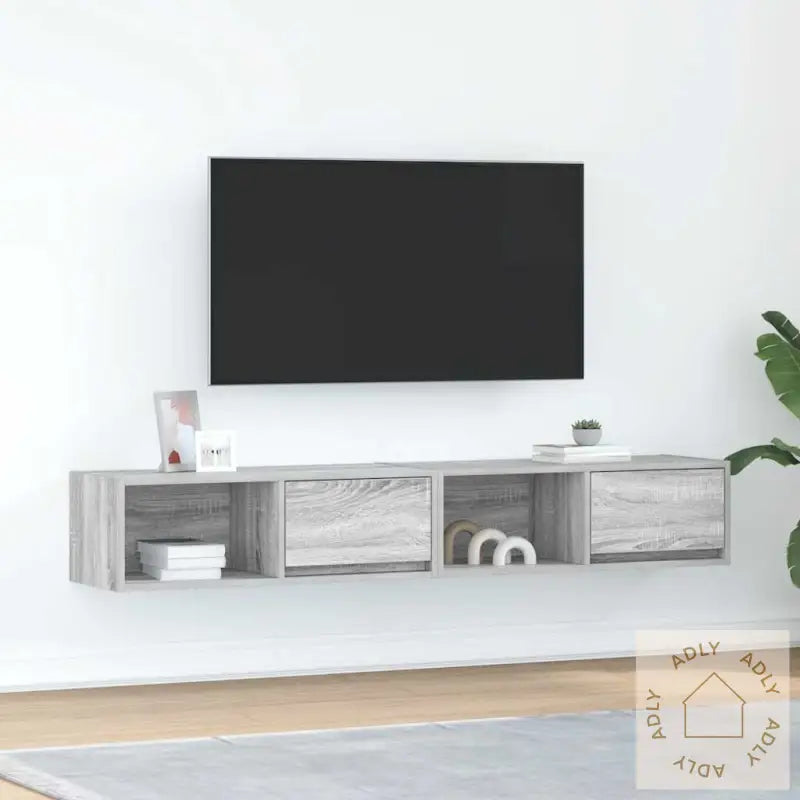 Stabilt og slitesterkt materiale: Benkene er laget av konstruert tre, kjent for å være både robust og holdbart. Dette gir en jevn overflate som beskytter mot fuktighet, vridninger og sprekker – et ideelt valg for møbler du vil ha glede av lenge.Rikelig med oppbevaringsplass: Hver TV-benk har god plass til alt du trenger å holde organisert – magasiner, bøker, DVD-er og multimedieenheter får sin egen plass, lett tilgjengelig og oversiktlig.Stabil og solid bordplate: Den sterke toppen på benken gir et trygt sted for TV-en og elektronikk, samtidig som den tåler pyntegjenstander, vaser eller grønne planter som gir stua eller soverommet det lille ekstra.Plassbesparende design: Løsningen med veggmontering gjør det enkelt å spare gulvplass og skape et moderne, rent uttrykk i hjemmet. Enten du skal innrede en liten leilighet eller ønsker mer plass i en større stue, får du fleksible møbler som kan tilpasses etter rommet.Enkel å vedlikeholde: Med en glatt overflate, blir rengjøringen enkel – klær lett av støv og flekker med en fuktig klut, slik at TV-benken alltid ser fin ut.Farge: grå sonomaMateriale: konstruert treSamlet mål (hver): 80 x 31 x 25,5 cm (B x D x H)Skuffedimensjoner: 37 x 23,5 x 19,5 cm (B x D x H)Totalt maks. vektkapasitet: 60 kgMaks. vekt per hylle: 20 kgMaks. vekt per skuff: 5 kgKommer med 1 skuff og 1 hylleMontering krevesLeveransen inkluderer:2 x TV-benkDenne pakken med to praktiske TV-benker i moderne design gjør det enkelt å bringe orden og stil til hjemmet, uansett om du ser etter nye møbler til hjemmet eller ønsker en smart løsning sammen med hagemøbler eller andre utendørsmøbler i huset.