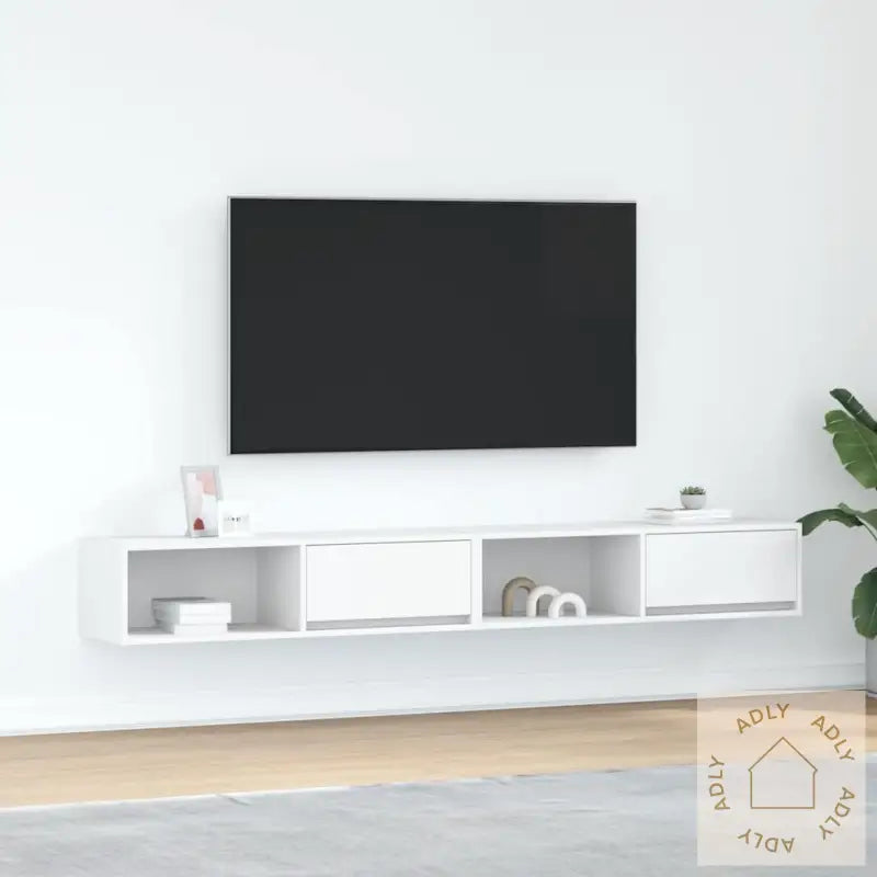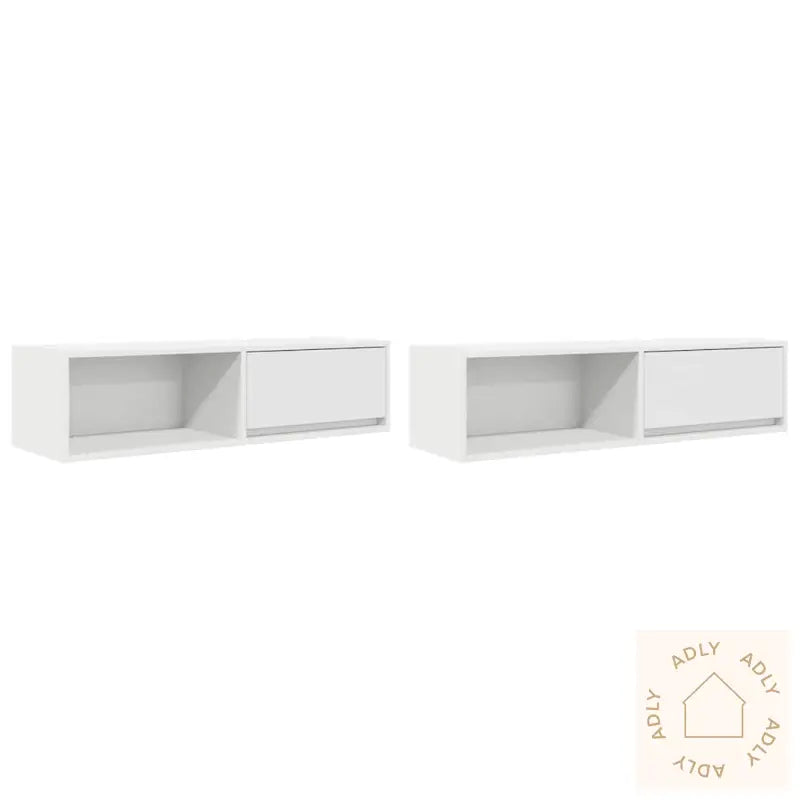 Stabilt og slitesterkt materiale: Benkene er laget av konstruert tre – et robust og holdbart materiale som gir stabilitet og lang levetid. Overflaten er jevn og motstandsdyktig mot fuktighet, vridning og sprekker, så det passer perfekt blant både TV-benker og bokhyller eller stående hyller i stuen.Rikelig med oppbevaringsplass: Med god plass til magasiner, bøker, DVDer og multimedieutstyr kan du enkelt organisere alt du trenger til hyggelige kvelder foran TV-en, samtidig som rommet ser ryddig ut.Solid og funksjonell bordplate: Den robuste toppen gir deg god plass til å sette TV, høyttalere og dekorelementer som vaser eller potteplanter – praktisk hverdagsmøbel som kombinerer oppbevaring og stil.Plassbesparende design: Siden TV-skapet monteres på veggen, frigjør du gulvplass som gjør rommet mer luftig. Perfekt der du vil kombinere ulike typer møbler og fortsatt ha god plass.Enkel å vedlikeholde: Glatte overflater gjør at skapet lett kan tørkes av med en fuktig klut – ideelt for aktive hjem og deg som vil bruke tiden på noe annet enn rengjøring.Farge: hvitMateriale: konstruert treSamlet mål (hver): 100 x 31 x 25,5 cm (B x D x H)Skuffedimensjoner: 47 x 23,5 x 19,5 cm (B x D x H)Totalt maks. vektkapasitet: 60 kgMaks. vektkapasitet per hylle: 20 kgMaks. vektkapasitet per skuff: 5 kgMed 1 skuff og 1 hylleMontering kreves: jaLeveransen inneholder:2 x TV-benker