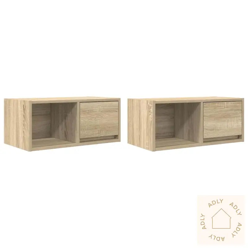 Stabilt og slitesterkt materiale: Disse TV-benkenene er laget av konstruert tre med jevn overflate, som både tåler fuktighet og holder formen over tid. Det gir ekstra lang levetid, slik at du får stabile hagemøbler eller innendørsmøbler som varer.Rikelig med oppbevaringsplass: Med både hylle og skuff har du god plass til alt fra magasiner og bøker til DVDer og multimedieenheter. Alt du trenger til underholdningsområdet ditt er lett tilgjengelig og ryddig organisert.Stabil og solid bordplate: Den solide platen gir stødig oppbevaring til TV-en, stereoanlegget eller dekorative elementer som potteplanter og vaser. Du kan enkelt vise frem dine favoritting – samtidig som alt står trygt.Plassbesparende design: Siden benken kan monteres på veggen frigjøres gulvplass, noe som gjør rengjøringen enklere og gir rommet et luftig preg – spesielt praktisk i mindre boliger eller leiligheter.Enkel å vedlikeholde: Den glatte overflaten er enkel å holde ren – en rask tørk med en fuktig klut er nok. Konstruert tre er kjent for å være brukervennlig og krever minimalt vedlikehold, så TV-benken ser fin ut med lite innsats.Farge: sonoma eikMateriale: konstruert treSamlet mål (hver): 60 x 31 x 25,5 cm (B x D x H)Skuffedimensjoner: 27 x 23,5 x 19,5 cm (B x D x H)Totalt maks. vektkapasitet: 60 kgMaks. vektkapasitet per hylle: 20 kgMaks. vektkapasitet per skuff: 5 kgMed 1 skuff og 1 hylleMontering kreves: jaLeveransen inneholder:2 x TV-benker