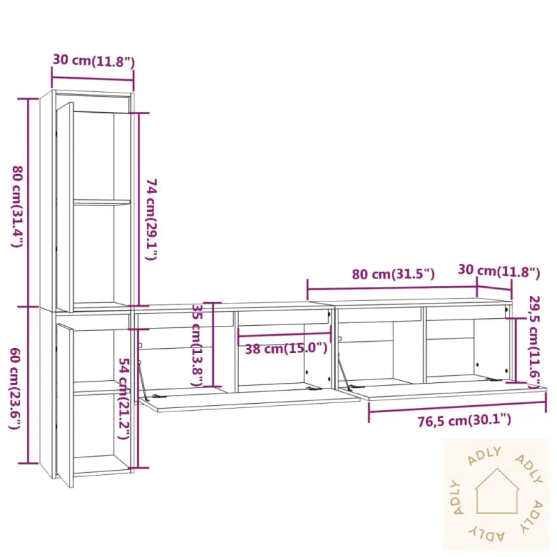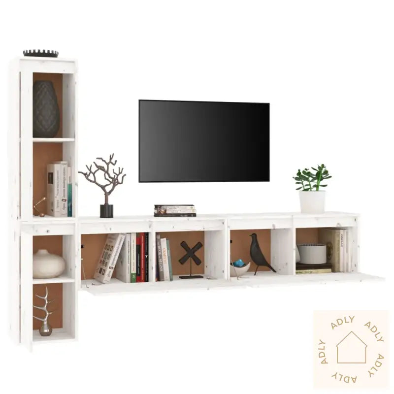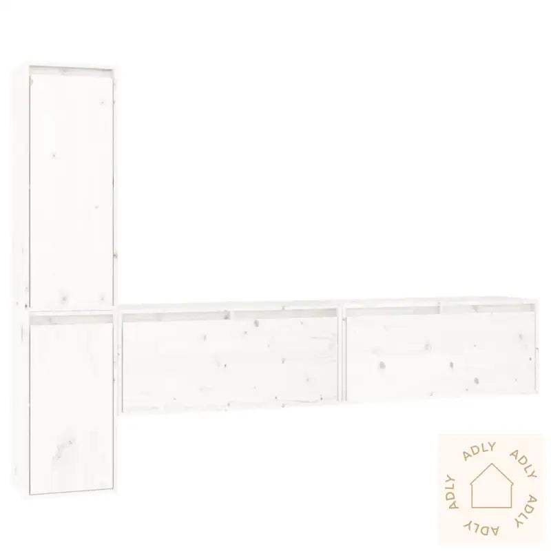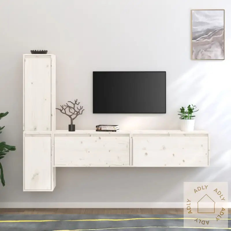 Farge: hvitMateriale: heltre furuMontering kreves: jaLeveransen inneholder:1 x TV-benk: 30 x 30 x 80 cm (B x D x H)1 x TV-benk: 30 x 30 x 60 cm (B x D x H)2 x TV-benker: 80 x 30 x 35 cm (B x D x H)