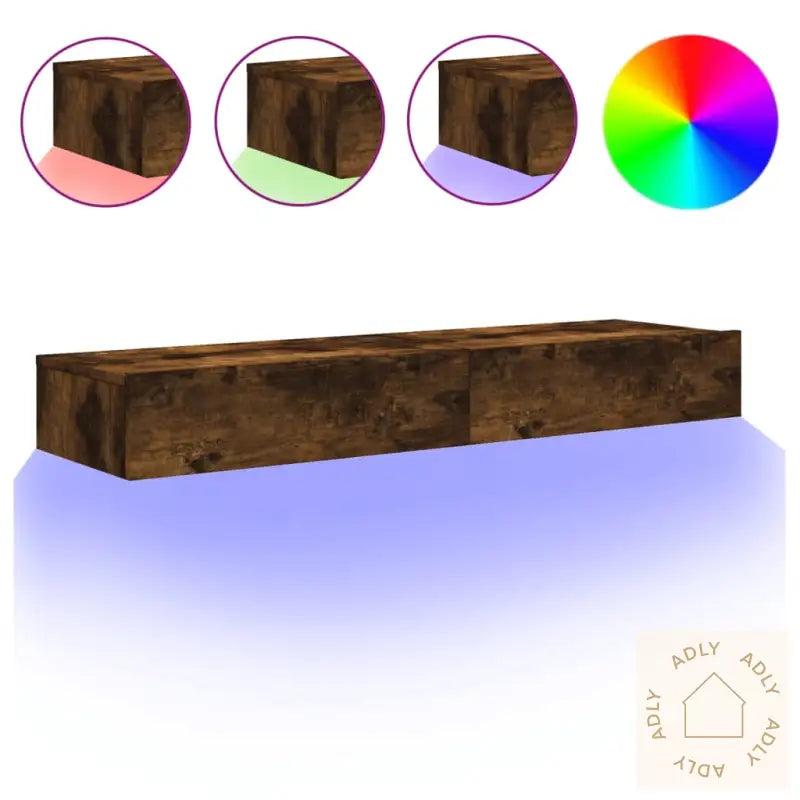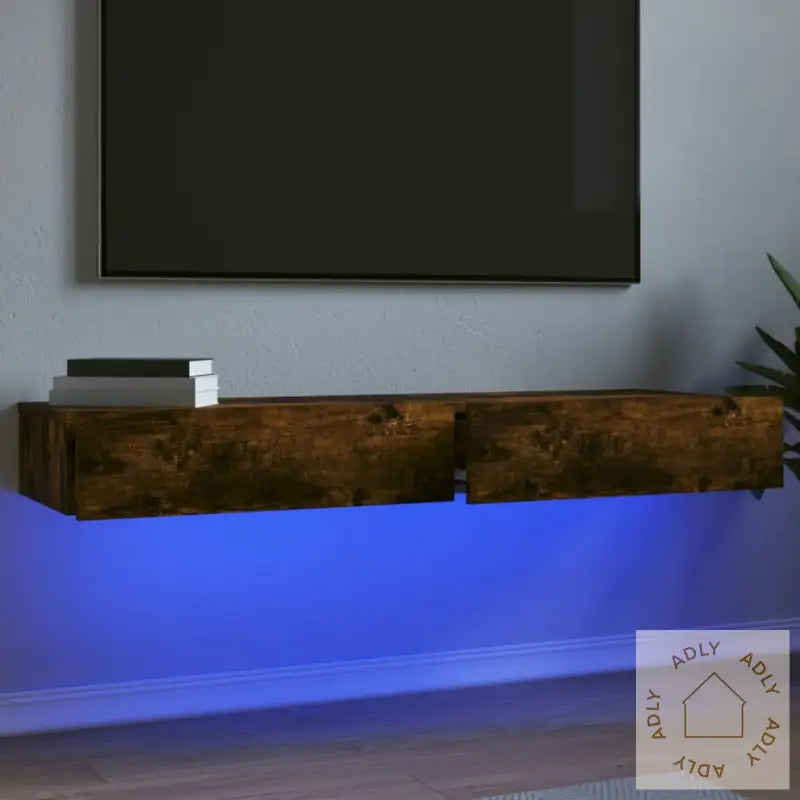 TV-benken har USB-kontakt for LED-lysene, men 5V USB-strømkilde må kjøpes separat.Skruer og plugger følger ikke med for veggmontering. For sikker montering bør du velge skruer og plugger som matcher dine veggtyper – spør gjerne en fagperson om du er usikker. Følg også monteringsinstruksjonene nøye.Farge: Røkt eikMateriale: Konstruert treTotale mål: 120 x 35 x 15,5 cm (L x B x H)Mål per TV-benk: 60 x 35 x 15,5 cm (L x B x H)Maksimal total lastekapasitet: 50 kgMontering kreves: JaLeveransen inkluderer:2 x TV-benker