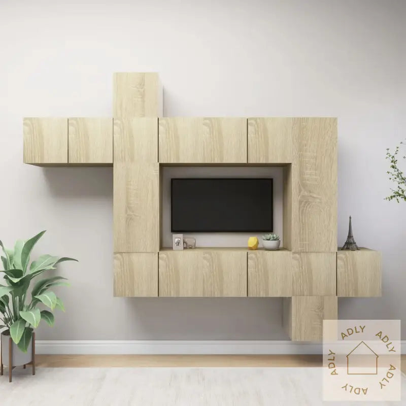 TV-benken er laget av konstruert tre med fin dekor i sonoma eik, noe som gir et solid inntrykk og passer med de fleste møbler til hjemmet. Skapene monteres på veggen, så de tar ikke plass på gulvet og gir et ryddig uttrykk. Flere åpne rom og hyller gir masse plass til magasiner, elektronikk, spillkonsoller eller andre ting du vil ha lett tilgjengelig, og det er enkelt å organisere alt på ett sted. TV-benken er også veldig enkel å holde ren – bare tørk over med en fuktig klut.