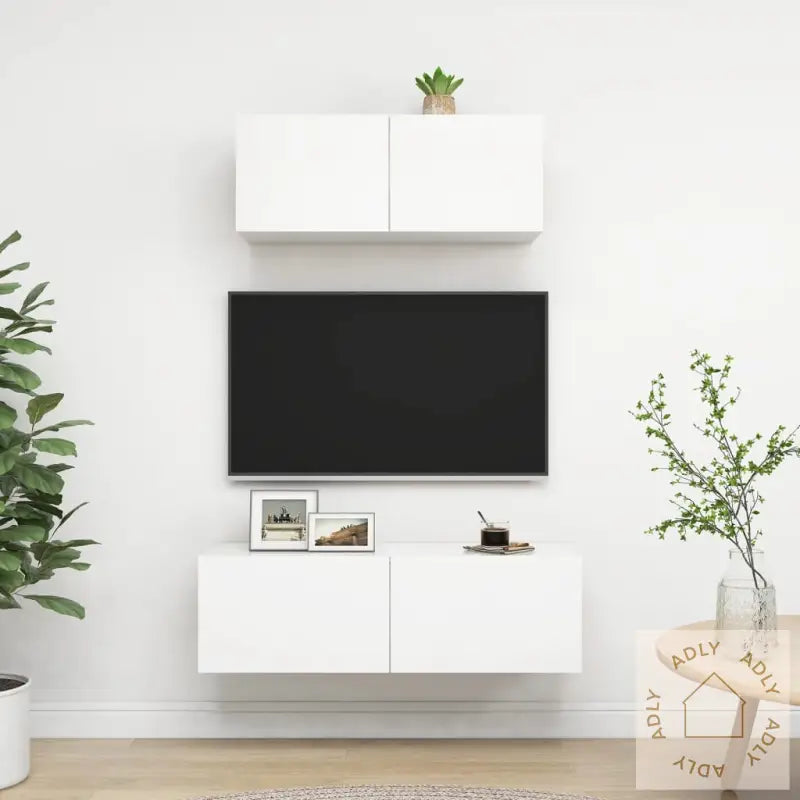 Farge: hvitMateriale: konstruert treMontering kreves: jaLeveransen inneholder:1 x TV-benk: 100 x 30 x 30 cm (B x D x H)1 x TV-skap: 80 x 30 x 30 cm (B x D x H)