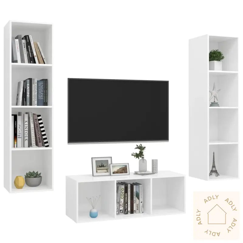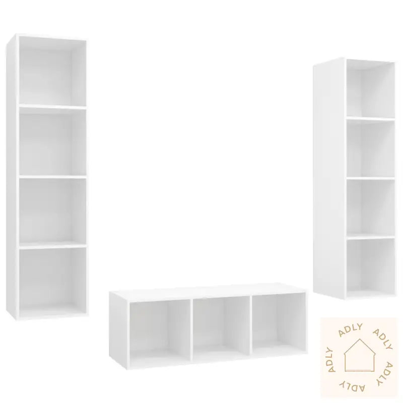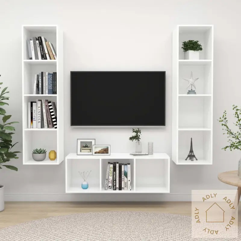 Settet er laget av konstruert tre med hvit finish, noe som både gir et moderne preg og sikrer at det er enkelt å vaske over med en fuktig klut – veldig praktisk i hverdagen. Monteringen er enkel, så du kan raskt få glede av ditt nye møbel. Dette TV-benksettet gir rett og slett hjemmet ditt både stil og orden, uansett om du kombinerer det med andre møbler eller bruker det som et blikkfang.