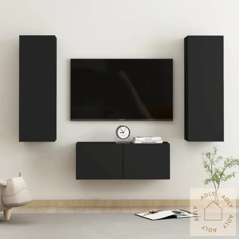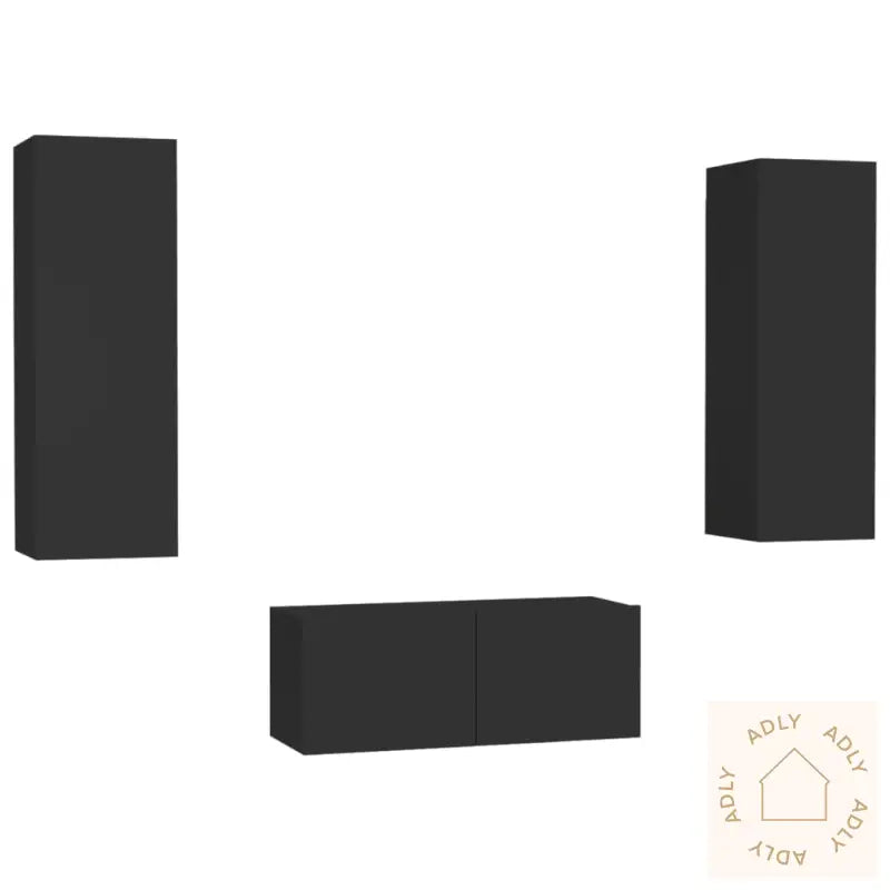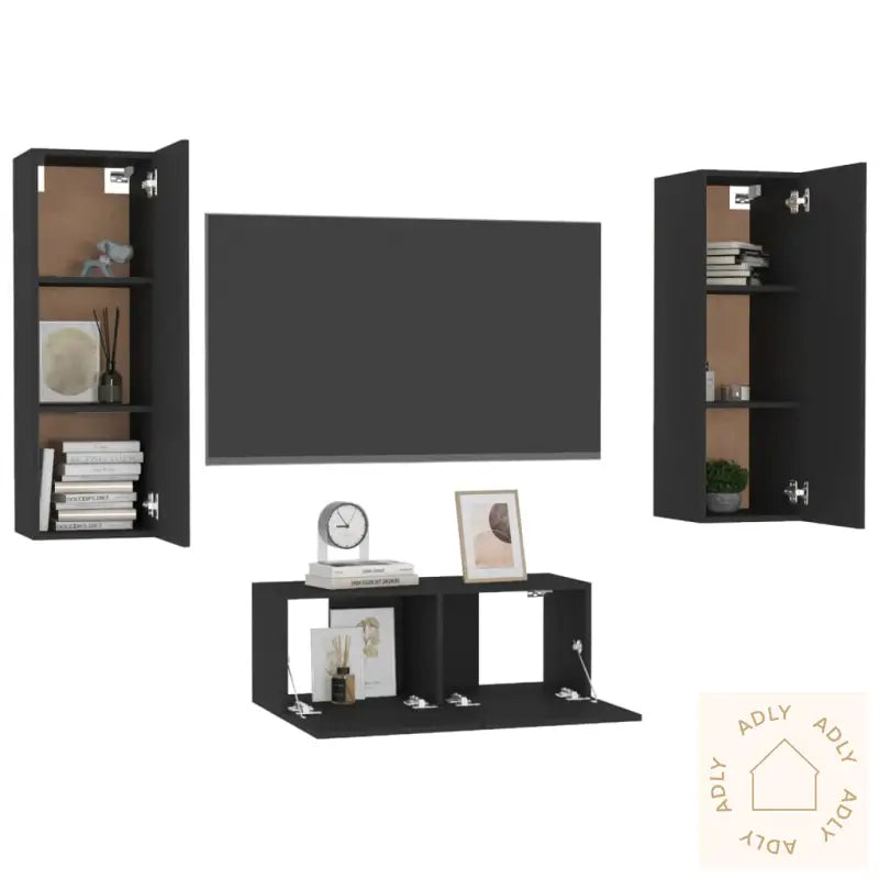 Farge: svartMateriale: konstruert treMål (L): 80 x 30 x 30 cm (B x D x H)Mål (M): 30,5 x 30 x 90 cm (B x D x H)Montering kreves: jaLeveransen inneholder:1 x TV-benk (L)2 x TV-benker (M)