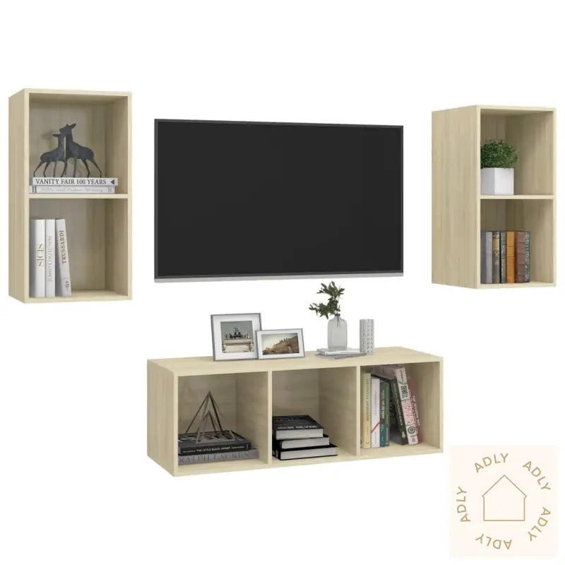 Dette vegghengte TV-benksettet i trendy sonoma eik gir deg rikelig med oppbevaringsplass, perfekt for å holde både medieenheter, fjernkontroller og andre småting godt organisert. Med sitt stilrene design blir det et smart og iøynefallende møbel til hjemmet som passer inn i ulike interiørstiler.