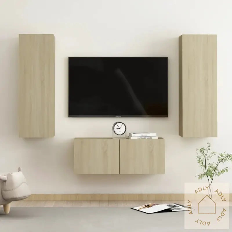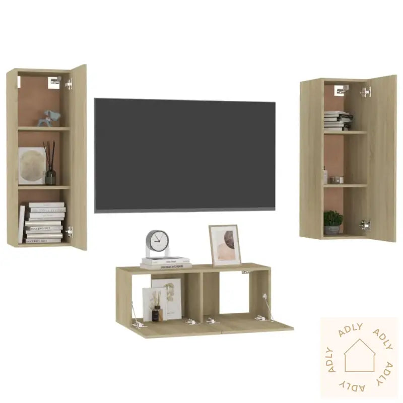 Dette solide TV-benksettet i sonoma eik er laget for å være midtpunktet i stua, takket være sitt moderne design og praktiske funksjoner. Med sine rene linjer og stilrene uttrykk passer det perfekt som en del av dine møbler til hjemmet.