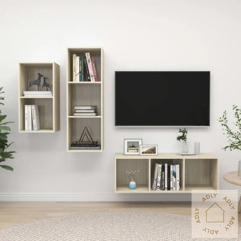 Dette vegghengte TV-benksettet i sonoma eik gir deg godt med oppbevaringsplass, slik at det blir enkelt å holde orden på alt fra elektronikk til fjernkontroller og andre ting du vil ha tilgjengelig. Designet er både praktisk og stilrent, så settet passer perfekt inn blant moderne møbler til hjemmet ditt og bidrar til et mer ryddig miljø.