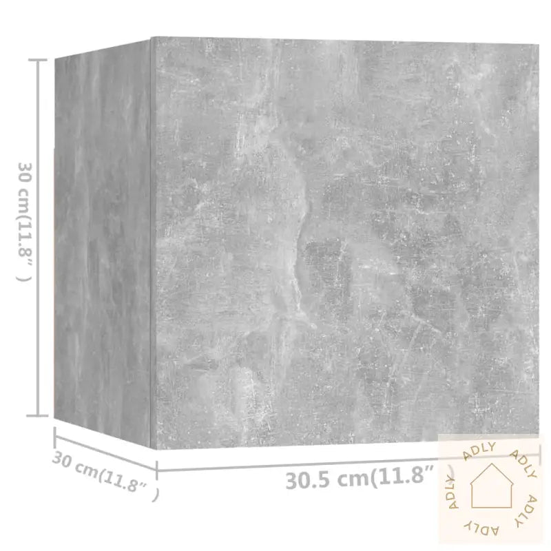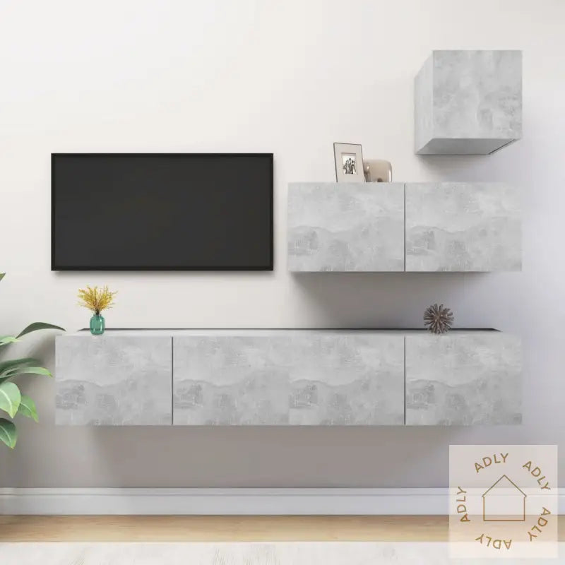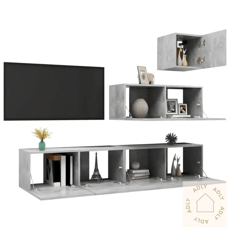 Farge: betonggråMateriale: konstruert treMontering kreves: jaLeveransen inneholder:1 x TV-benk: 30,5 x 30 x 30 cm (B x D x H)3 x TV-skap: 80 x 30 x 30 cm (B x D x H)