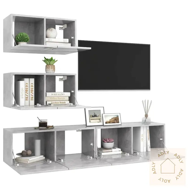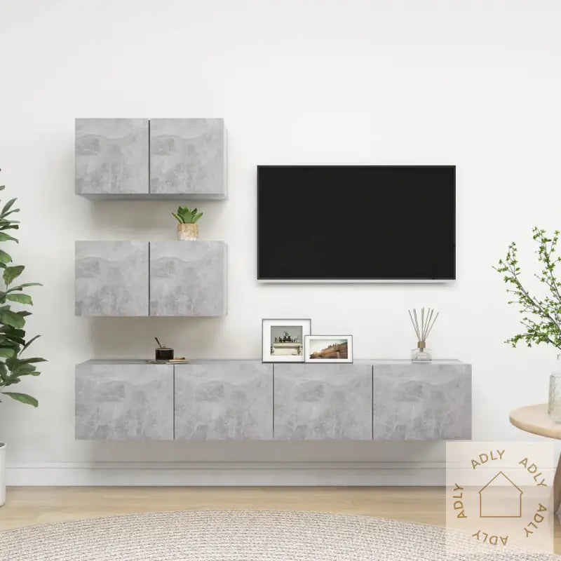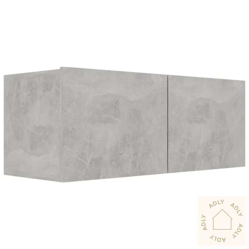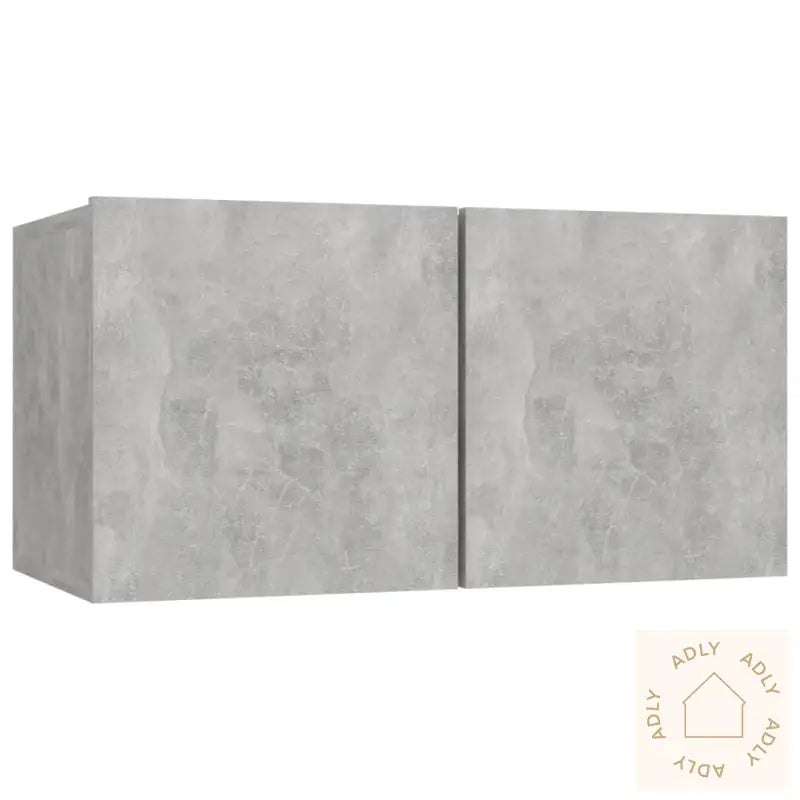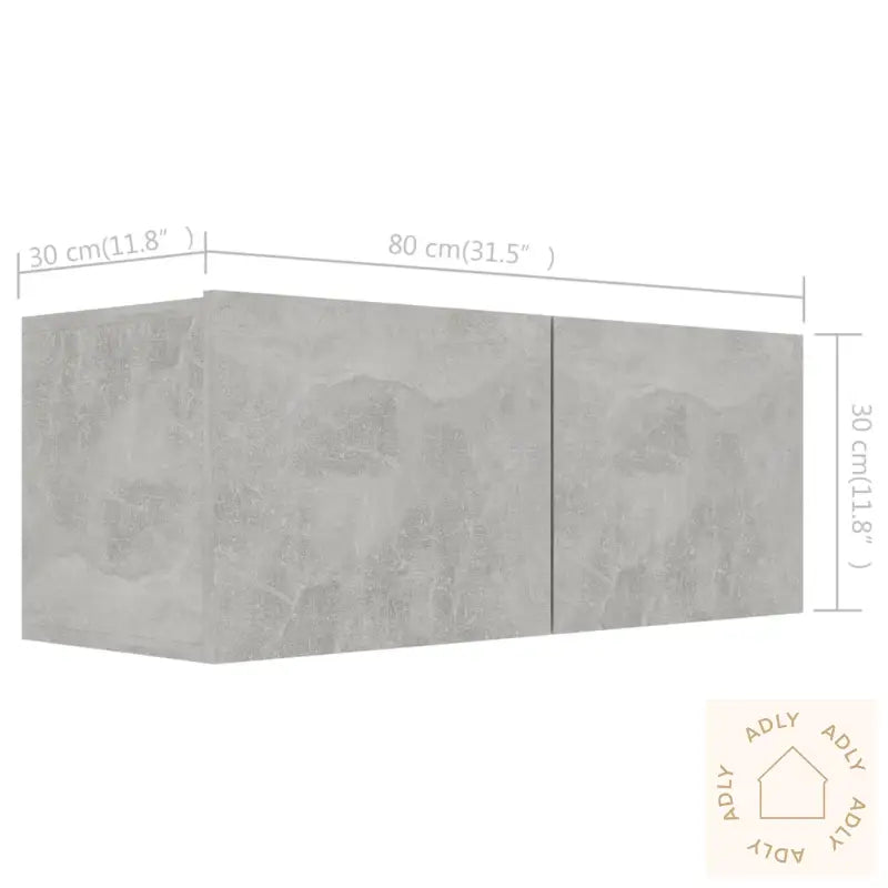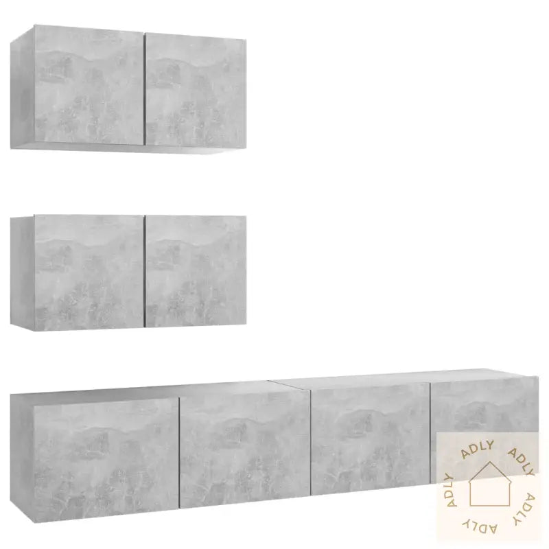 Farge: betonggråMateriale: konstruert treMontering kreves: jaLeveransen inneholder:2 x TV-benker: 60 x 30 x 30 cm (B x D x H)2 x TV-skap: 80 x 30 x 30 cm (B x D x H)