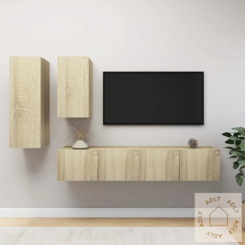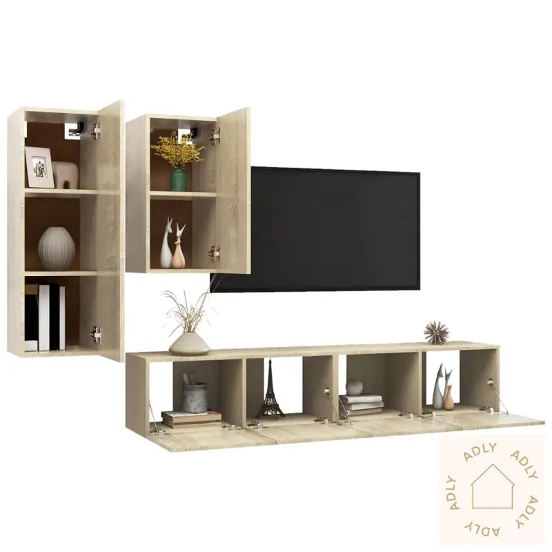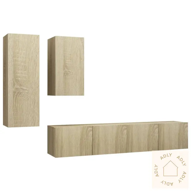 Farge: sonoma eikMateriale: konstruert treMontering kreves: jaLeveransen inneholder:1 x TV-benk: 30,5 x 30 x 90 cm (B x D x H)1 x TV-benk: 30,5 x 30 x 60 cm (B x D x H)2 x TV-skap: 80 x 30 x 30 cm (B x D x H)