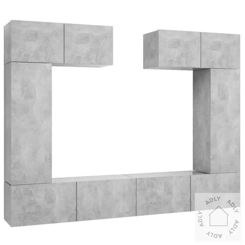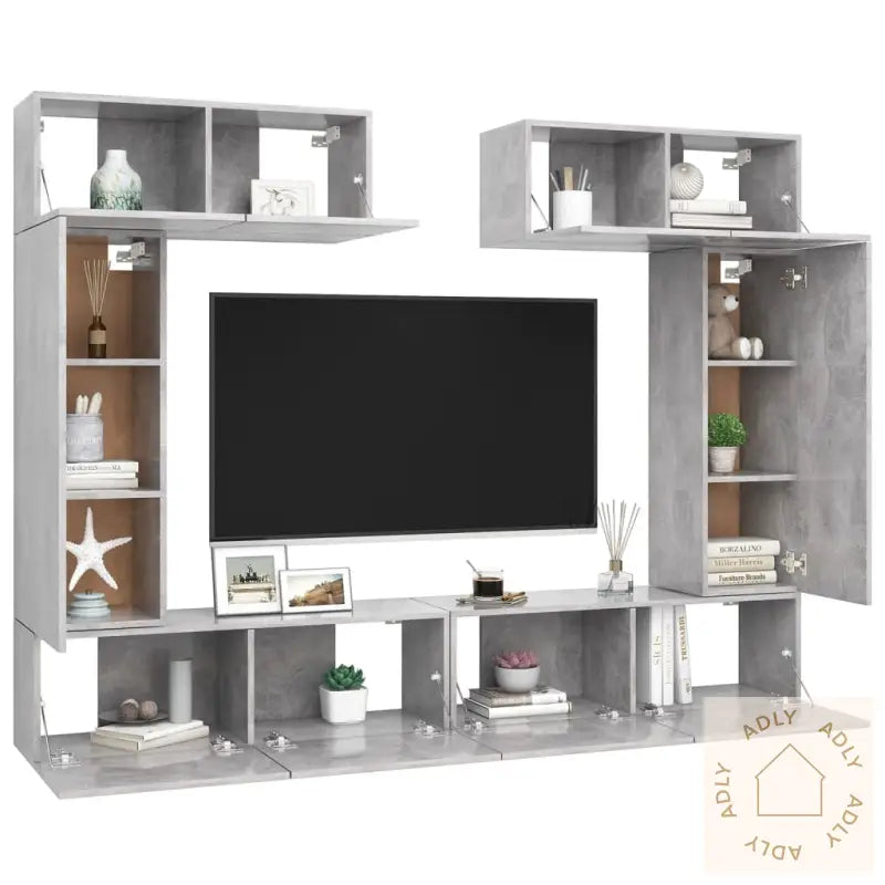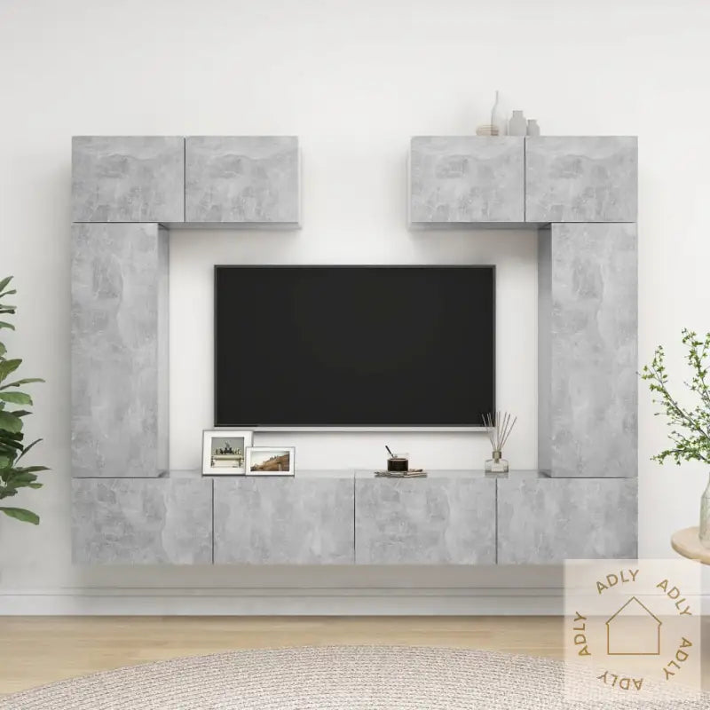Farge: betonggråMateriale: konstruert treMontering kreves: jaLeveransen inneholder:Mål 2 x TV-skap: 100 x 30 x 30 cm (B x D x H)2 x TV-benk: 30,5 x 30 x 90 cm (B x D x H)Mål 2 x TV-skap: 80 x 30 x 30 cm (B x D x H)