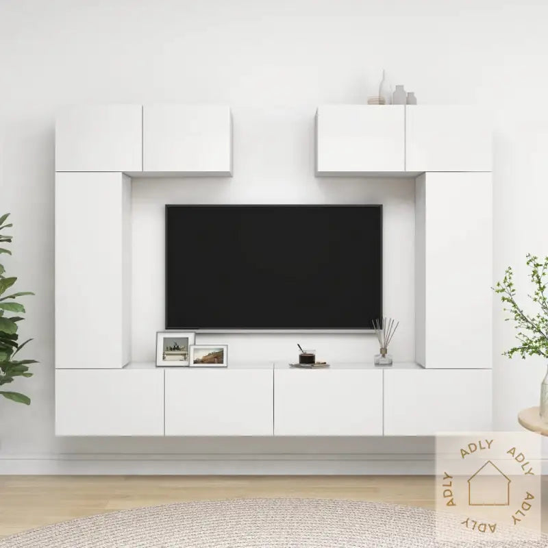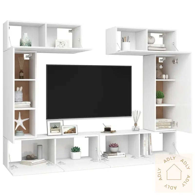 Farge: hvitMateriale: konstruert treMontering kreves: jaLeveransen inneholder:Mål 2 x TV-skap: 100 x 30 x 30 cm (B x D x H)2 x TV-benk: 30,5 x 30 x 90 cm (B x D x H)Mål 2 x TV-skap: 80 x 30 x 30 cm (B x D x H)Dette TV-benksettet passer godt sammen med andre møbler som bokhyller og stående hyller, og gir en helhetlig løsning for deg som ønsker smarte møbler til hjemmet. En gjennomført kombinasjon av funksjon og design, med fokus på lagringsplass.