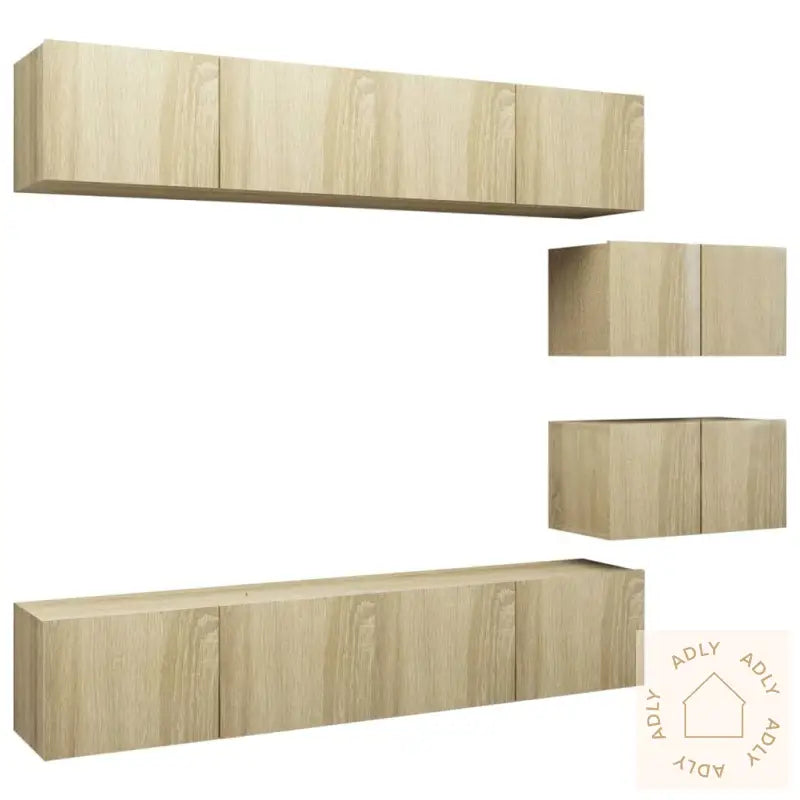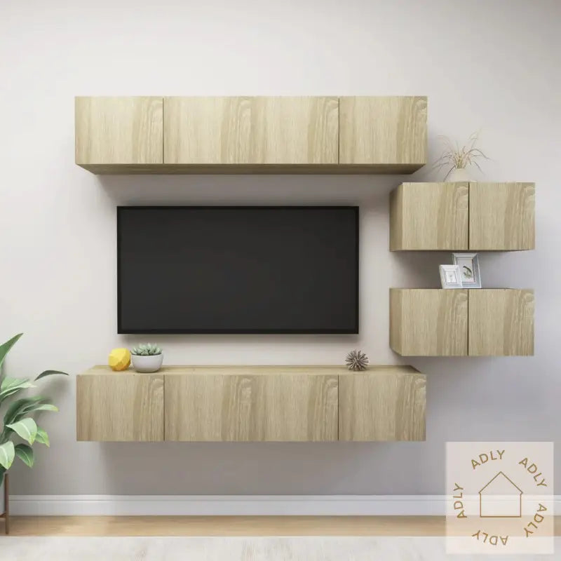 TV-benksettet leveres i en lekker sonoma eik-farge, noe som gir en varm og naturlig følelse til interiøret. Den solide konstruksjonen i konstruert tre sørger for at benkene og skapene tåler daglig bruk og varer lenge. Skapene henges på veggen, noe som gir et ryddigere uttrykk og frigjør gulvplass, samtidig som de gir god orden. Det gjør rengjøringen enkel – alt du trenger er en fuktig klut, så holder TV-benken seg flott i mange år.
