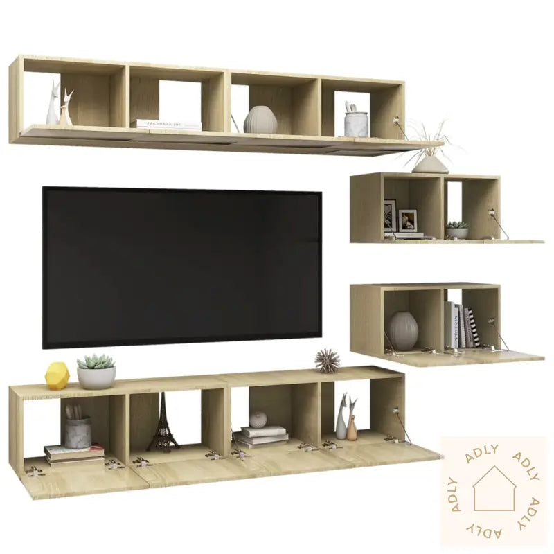 Farge: sonoma eikMateriale: konstruert treMontering kreves: jaLeveransen inneholder:Mål 4 x TV-skap: 80 x 30 x 30 cm (B x D x H)2 x TV-benker: 60 x 30 x 30 cm (B x D x H)