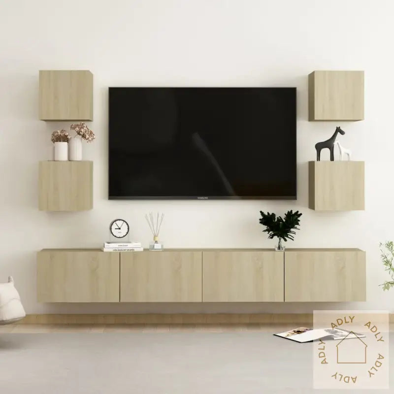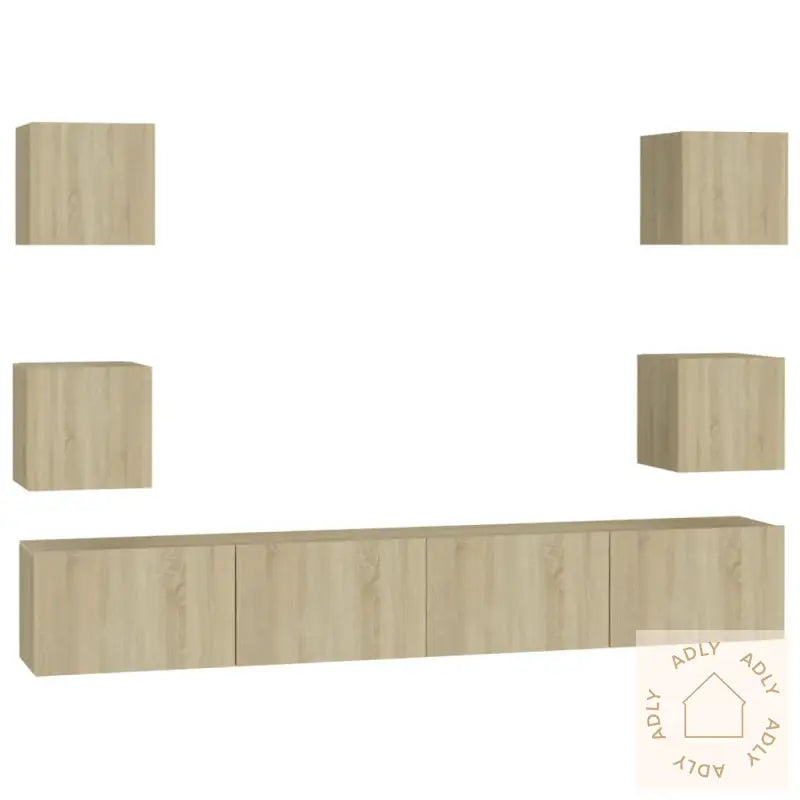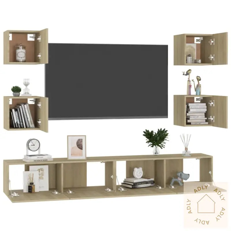 Farge: sonoma eikMateriale: konstruert treMål (L): 100 x 30 x 30 cm (B x D x H)Mål (S): 30,5 x 30 x 30 cm (B x D x H)Montering kreves: jaLeveransen inneholder:2 x TV-benk (L)4 x TV-benk (S)