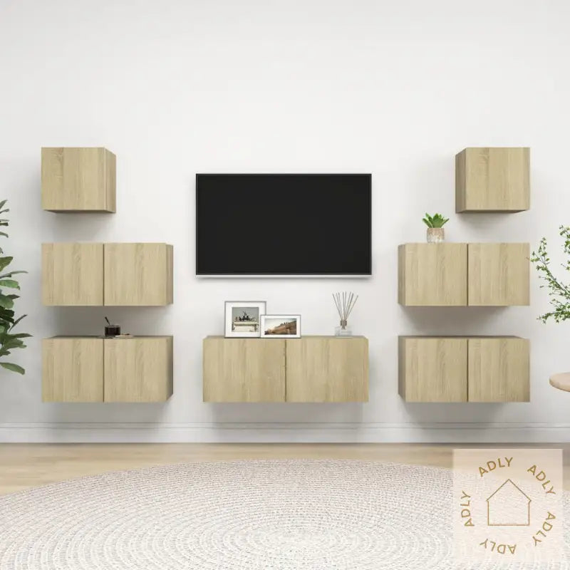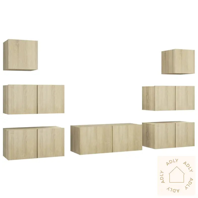 Farge: sonoma eikMateriale: konstruert treMontering kreves: jaLeveransen inneholder:4 x TV-benker: 60 x 30 x 30 cm (B x D x H)1 x TV-skap: 80 x 30 x 30 cm (B x D x H)2 x TV-benker: 30,5 x 30 x 30 cm (B x D x H)