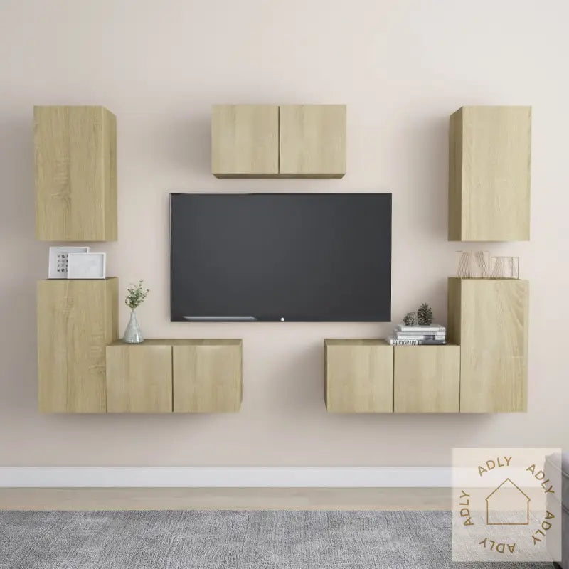 Dette solide TV-benksettet i sonoma eik fungerer som et naturlig blikkfang i stuen med sitt moderne, men praktiske design. Monteringen på veggen gir møbelet et stilrent og tidløst preg som glir fint inn sammen med andre møbler til hjemmet.