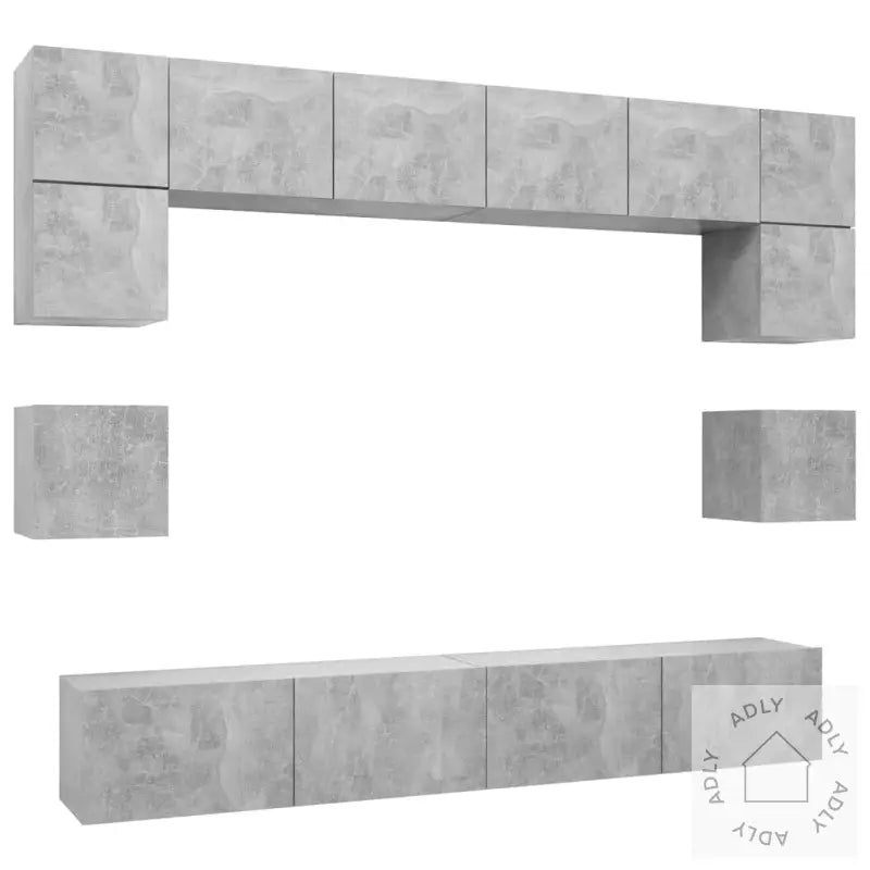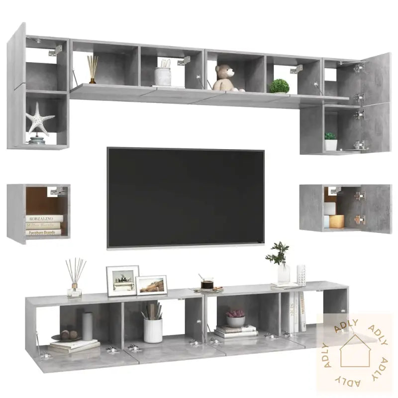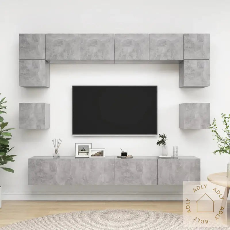 Dette vegghengte TV-benksettet gir deg masse oppbevaringsplass, slik at du enkelt kan organisere ting som fjernkontroller, magasiner, spillkonsoller og pyntegjenstander. Settet er både praktisk og dekorativt, noe som gjør det til et iøynefallende tillegg blant dine møbler til hjemmet. Det minimalistiske designet i betonggrått passer inn i mange ulike interiørstiler, enten du liker moderne eller mer klassiske uttrykk.