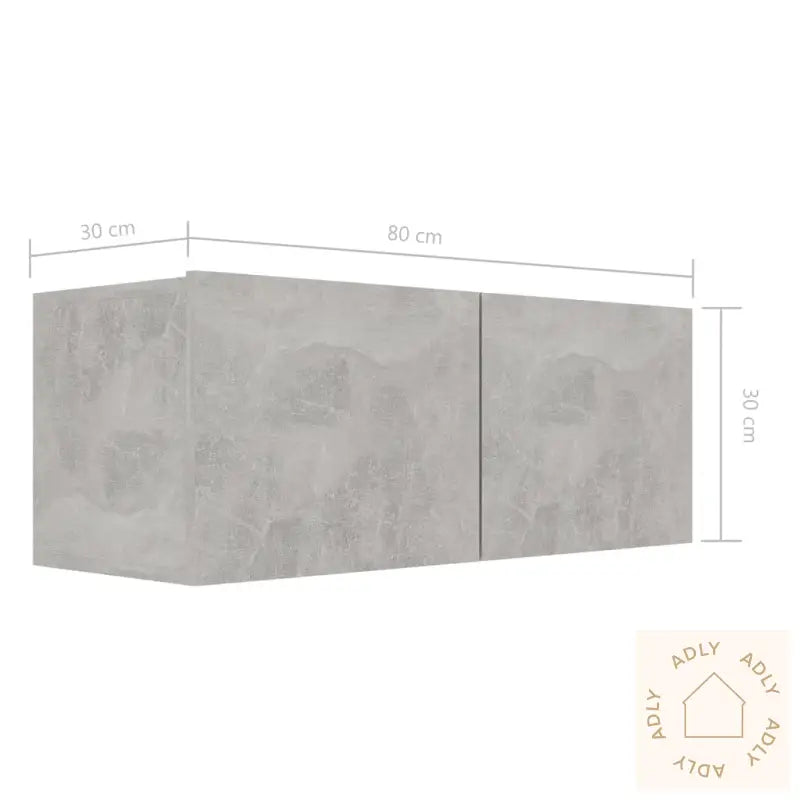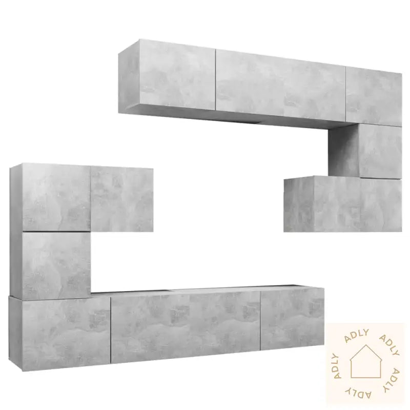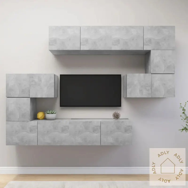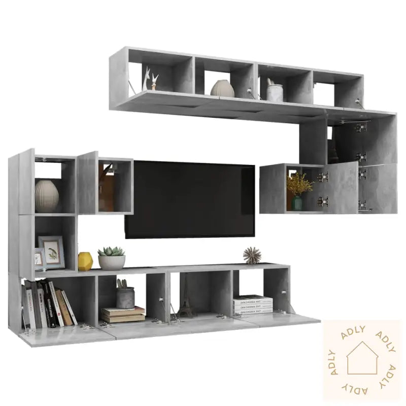 Farge: betonggråMateriale: konstruert treMontering kreves: jaLeveransen inneholder:Mål 4 x TV-skap: 80 x 30 x 30 cm (B x D x H)2 x TV-benker: 60 x 30 x 30 cm (B x D x H)2 x TV-benker: 30,5 x 30 x 30 cm (B x D x H)