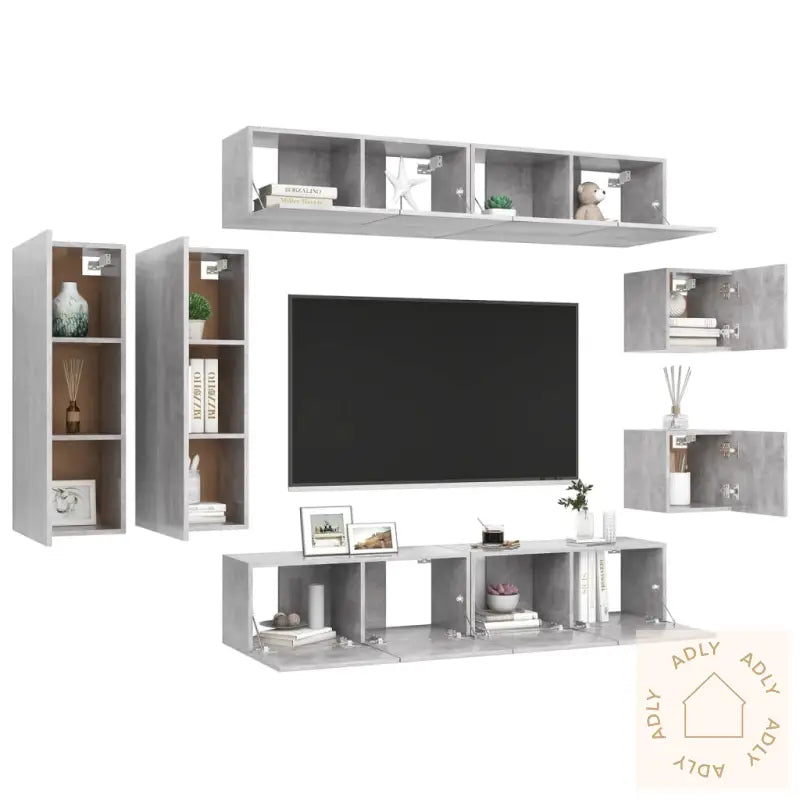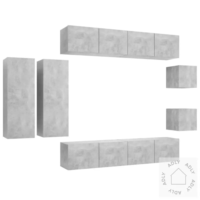 Farge: betonggråMateriale: konstruert treMontering kreves: jaLeveransen inneholder:2 x TV-benker: 30,5 x 30 x 30 cm (B x D x H)2 x TV-benker: 30,5 x 30 x 90 cm (B x D x H)4 x TV-skap: 80 x 30 x 30 cm (B x D x H)