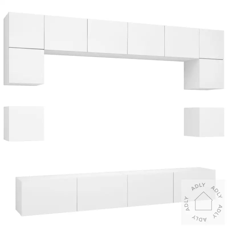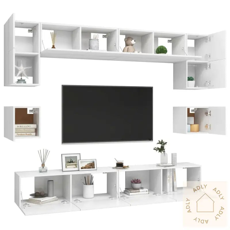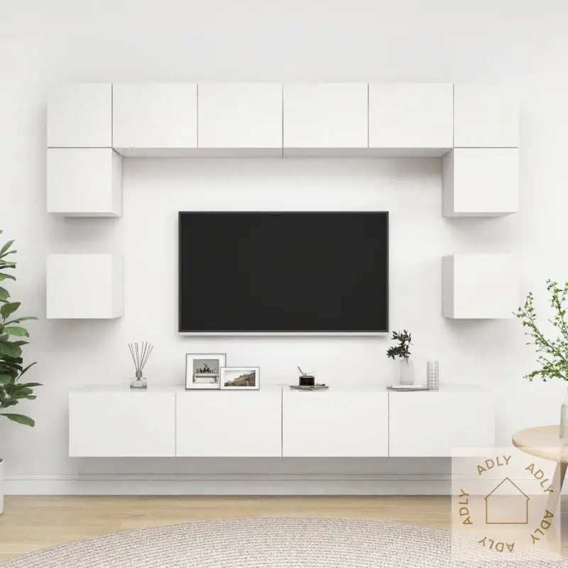 Farge: hvitMateriale: konstruert treMontering kreves: jaLeveransen inneholder:Mål 2 x TV-skap: 100 x 30 x 30 cm (B x D x H)Mål 2 x TV-skap: 80 x 30 x 30 cm (B x D x H)2 x TV-benker: 60 x 30 x 30 cm (B x D x H)2 x TV-benker: 30,5 x 30 x 30 cm (B x D x H)
