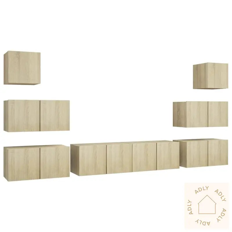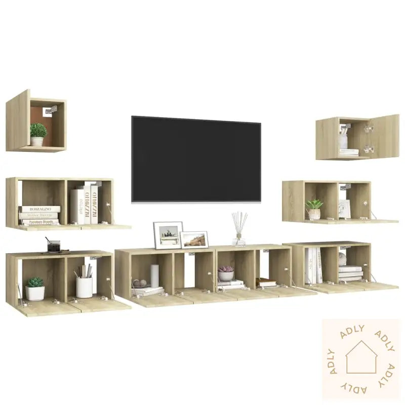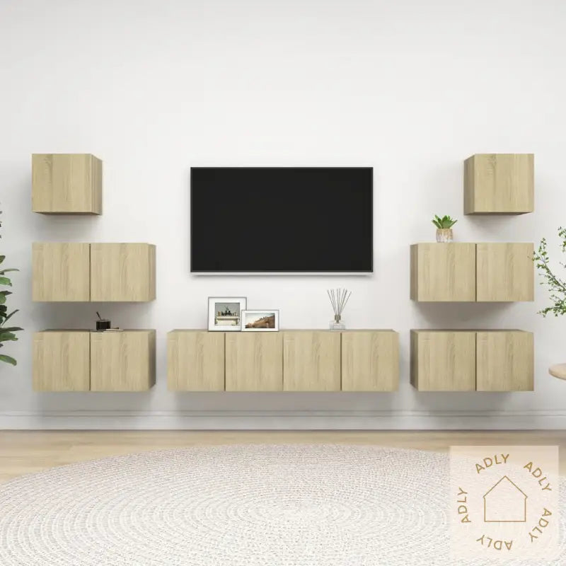 Farge: sonoma eikMateriale: konstruert treMontering kreves: jaLeveransen inneholder:6 x TV-benker: 60 x 30 x 30 cm (B x D x H)2 x TV-benker: 30,5 x 30 x 30 cm (B x D x H)Enten du leter etter praktiske bokhyller og stående hyller, eller drømmer om hagemøbler og nye møbler til hjemmet, gir dette TV-benksettet i sonoma eik deg fleksibel lagring og et rent, moderne uttrykk i stua.