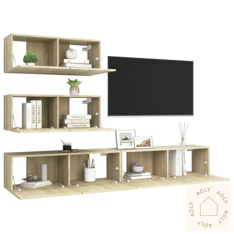 Dette TV-benksettet i moderne stil gir stuen et løft med sitt elegante utseende og store lagringsplass – perfekt for deg som ønsker møbler til hjemmet som er både praktiske og dekorative. Designet i den tidløse sonoma eik-fargen passer enkelt inn blant andre møbler, og gjør at settet blir et naturlig blikkfang.