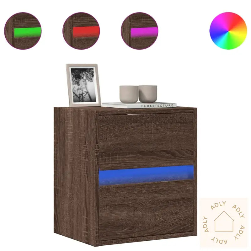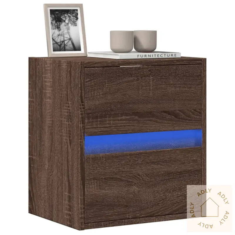Skruer og plugger til innendørs vegg følger ikke med. Finn beslag som passer til dine vegger, og kontakt en fagperson hvis du er usikker. Følg instruksjonene nøye under montering.Produktet har USB-kontakt og trenger en sertifisert 5V USB-strømkilde (ikke inkludert).Farge: brun eikMateriale: konstruert treMål: 41 x 31 x 45 cm (L x B x H)Antall skuffer: 2Med LED-lysMontering kreves: ja