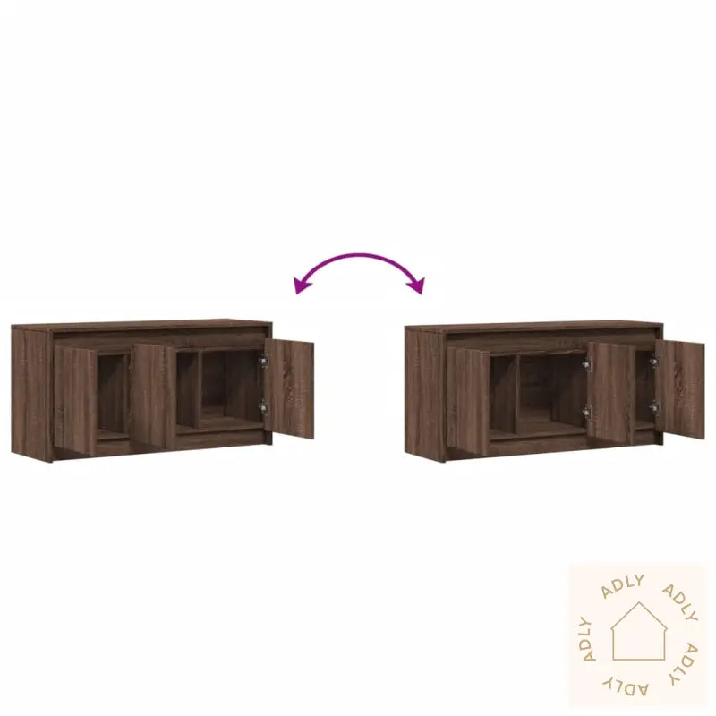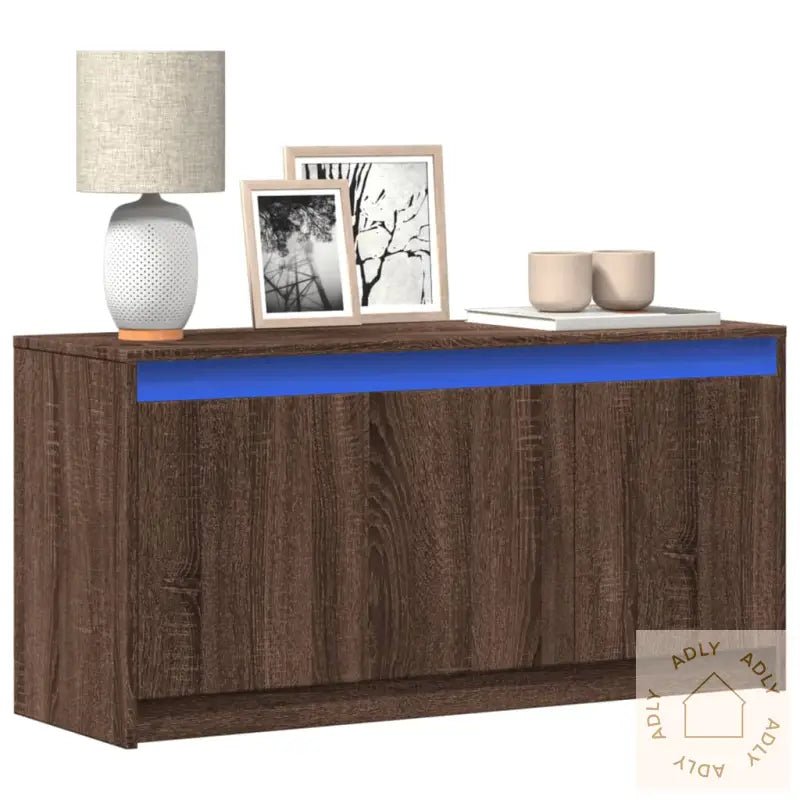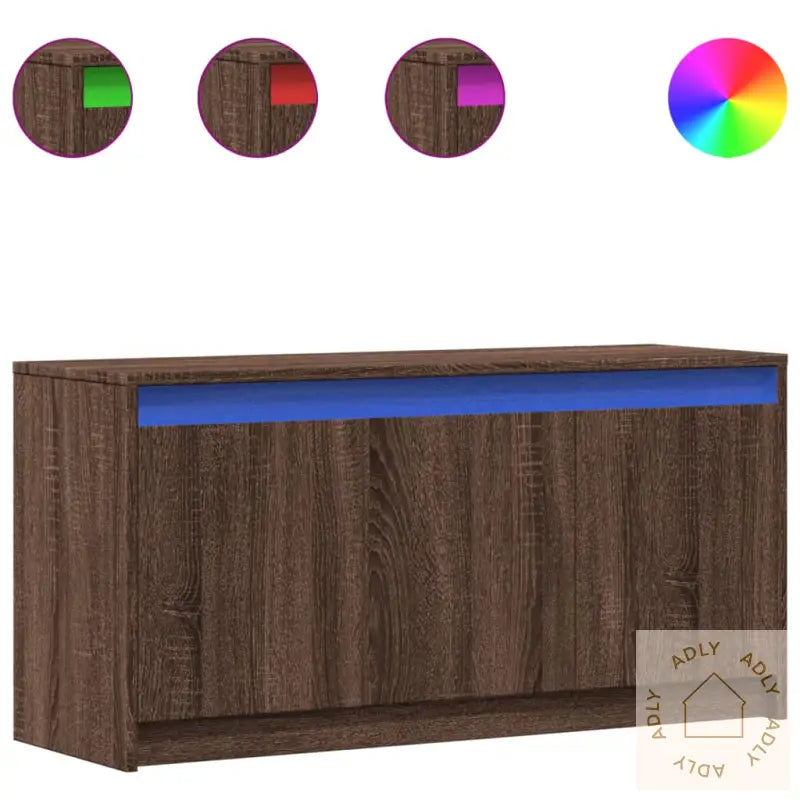 Holdbart materiale: Benken er laget av konstruert tre av høy kvalitet, noe som gir en jevn og elegant overflate med styrke og stabilitet. Dette materialet tåler også fuktighet godt, perfekt for daglig bruk og lang levetid.RGB LED-lys for atmosfære: Med innebygde LED-lys kan du sette stemningen akkurat slik du ønsker. Juster farger, modus og lysstyrke for å lage din egen visuelle stil – ideelt når du skal skape koselige filmkvelder eller ønsker et ekstra blikkfang rundt TV-en.Praktisk oppbevaringsplass: Benken har god plass til organisering av alt fra magasiner og bøker til DVDer og diverse multimedieenheter. Du har alt ryddig og lett tilgjengelig, samtidig som du holder stuen fri for rot.Robust bordplate: Den solide platen tåler maksimal lastekapasitet på 70 kg totalt. Du kan trygt plassere TV-en din, lydanlegg, eller pyntegjenstander som vaser og planter på denne brun eik-overflaten uten bekymringer – og hver hylle bærer opptil 20 kg.Godt å vite: