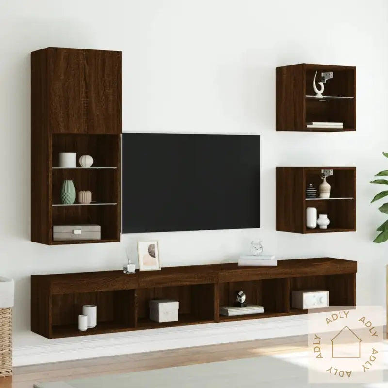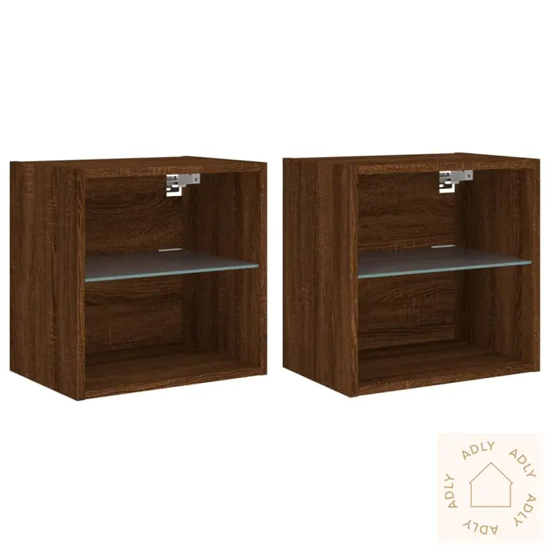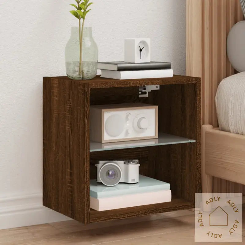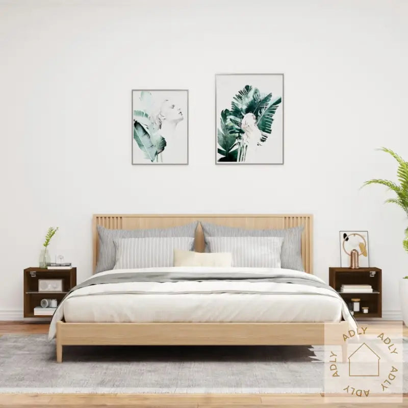 Slitesterkt materiale: Det konstruerte treverket gir en jevn og pen overflate, samtidig som det sikrer lang levetid, god styrke og motstand mot fukt. Du får dermed både holdbarhet og enkel vedlikehold i samme produkt.Rikelig med lagringsplass: Nattbordene gir deg god oppbevaringsplass til alt du vil ha i nærheten av sengen – enten det er magasiner, bøker, fjernkontroller eller småting du ellers fort kan miste oversikt over. Alt holder seg organisert og lett tilgjengelig.RGB LED-lys: Med RGB LED-lys får du mangfoldige lysinnstillinger, slik at du enkelt kan sette stemningen på soverommet ditt. Velg mellom ulike farger og la lyset tilpasse seg automatisk – perfekt for en litt ekstra koselig atmosfære når du ønsker det. LED lys er også energieffektiv belysning som varer lenge.Visningsfunksjon: Den solide toppen i konstruert tre og glass gir en flott flate hvor du kan vise frem dekorasjoner, bilder, potteplanter eller andre pyntegjenstander.Veggmontert design: Spar gulvplass og få et ryddigere rom med den veggmonterte løsningen. Nattbordene henger elegant på veggen og gir ekstra oppbevaringsplass uten å ta plass på gulvet – perfekt for deg som ønsker en stilren look med god funksjonalitet.Godt å vite: