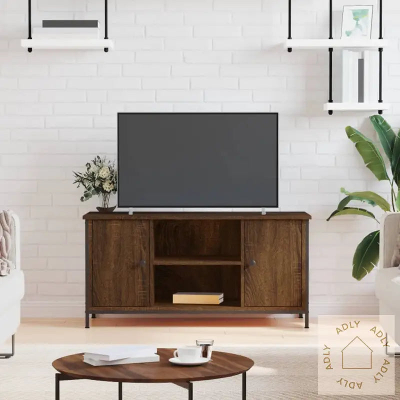 Slitesterkt materiale: Benken er laget av konstruert tre av høy kvalitet, med en glatt overflate som tåler daglig bruk. Den er solid, stabil, og motstandsdyktig mot fuktighet, slik at denne TV-benken varer lenge – perfekt for norske hjem.Rikelig med lagringsplass: Du får to rom med dører og to åpne hyller, noe som gjør det lett å holde DVD-spillere, spillkonsoller, streamingenheter og annet medieutstyr organisert og lett tilgjengelig. Alt du trenger ved underholdningssonen er samlet på ett sted, uten rot.Jernføtter: De solide jernføttene gir både god stabilitet og et hint av industriell stil til møblene dine. Dette gjør også TV-benken til et robust valg som står stødig på gulvet.Utstillingsplass: På toppen av TV-benken kan du vise frem favoritter som fotorammer, planter eller små dekorative detaljer og skape en personlig atmosfære rundt underholdningssenteret.Advarsel: