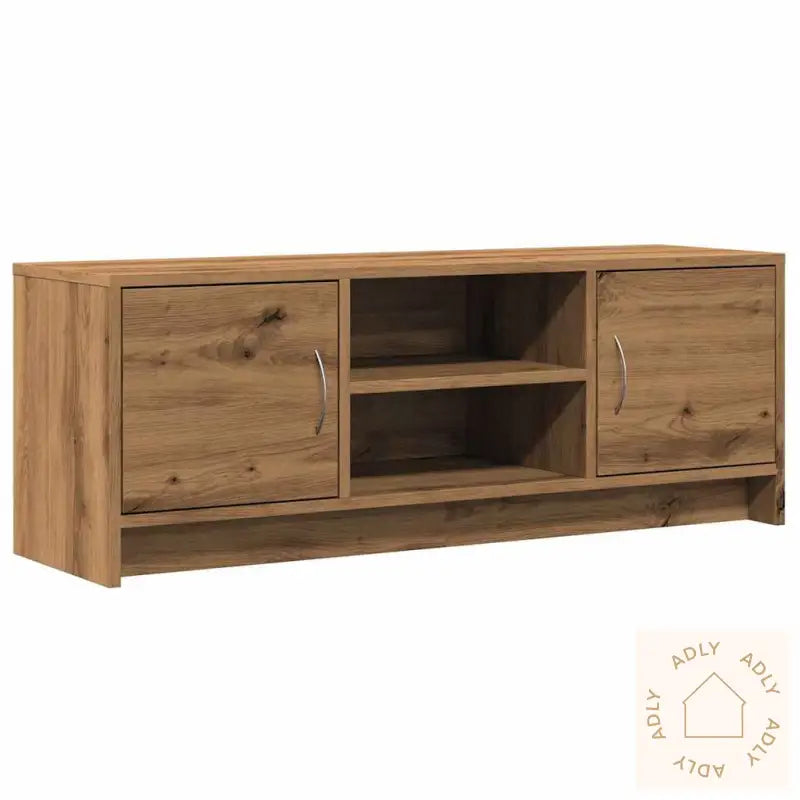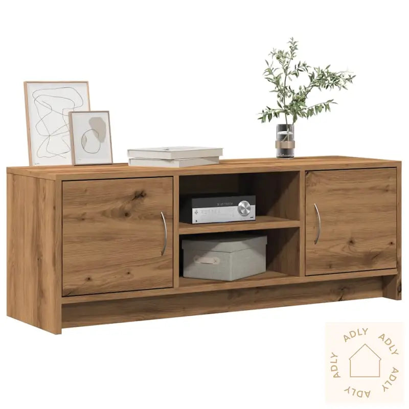Slitesterkt materiale: TV-benken er laget av konstruert tre i høy kvalitet, som gir en glatt overflate, samt styrke, solid stabilitet og ekstra motstand mot fukt. Dette gir deg en TV-benk som ser eksklusiv ut, og samtidig varer lenge.Rikelig med lagringsplass: Med to åpne rom og to hyller får du masse plass til å oppbevare magasiner, DVD-er, spill og tilbehør organisert. Du slipper rot og kan ha alt du trenger lett tilgjengelig.Robust bordplate: Den solide bordplaten gir god plass for dekor som fotorammer, grønne planter eller andre pyntegjenstander, og tåler at du bytter ut stilen etter sesong og behov.Praktiske dører: Skjul unna det du ikke vil ha fremme - slik holder du tingene dine rene og frie for støv bak dørene på mediaskapet. Enkelt, smart og ryddig!Farge: artisan eik – gir et lunt og tidløst uttrykk som matcher det meste av andre møbler til hjemmet eller hagemøbler, enten du liker klassisk eller moderne stil.Materiale: konstruert treMål: 102 x 30 x 37,5 cm (B x D x H) – en størrelse som får plass i både små og store rom uten at det blir trangt.Montering kreves: ja