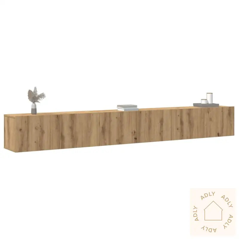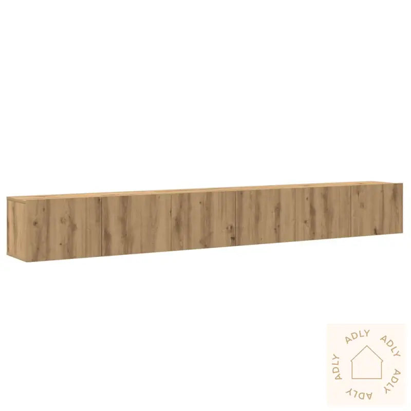Stabilt og slitesterkt materiale: Utført i konstruert tre, sikrer dette settet høy slitestyrke og stabilitet. Overflaten er enkel å holde ren og tåler fuktighet godt, så benkene holder seg pene lenge uten vridning eller sprekker – et trygt valg for både små og store hjem.Rikelig med lagringsplass: Med hele seks rom får du rikelig plass til alt fra bøker, magasiner, og DVD-er til alle multimedieenhetene dine. Alt holdes fint organisert og lett tilgjengelig, noe som gjør TV-benken både funksjonell og oversiktlig.Plassbesparende: Ved å montere TV-konsollen på veggen frigjør du verdifull gulvplass, slik at rommet fremstår både luftig og ryddig. En smart løsning for deg som ønsker pent og praktisk design med maksimal utnyttelse av plassen.Stabil og solid bordplate: Den robuste toppen gir et sikkert underlag for TV, stereoanlegg eller dekorasjoner som vaser og potteplanter. Du får både utstillingsplass og et slitesterkt møbel som tåler daglig bruk.Godt å vite: