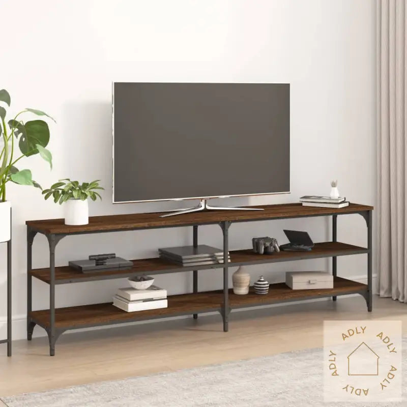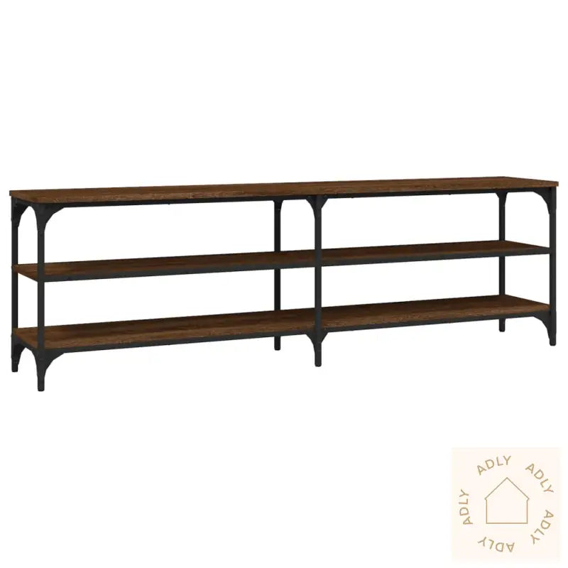 Slitesterkt materiale: TV-benken er laget av konstruert tre i høy kvalitet med en jevn finish, som både gir flott utseende og sikrer styrke, stabilitet og fuktbestandighet over tid. Den vakre brun eik-fargen fremhever møbelets karakter og gir det et varmt, tidløst uttrykk.Åpne oppbevaringshyller: Med 3 romslige åpne hyller får du praktisk oppbevaringsplass for alt du trenger rundt TV-en – perfekt til mottakere, DVD-er, spillkonsoller eller andre elektroniske enheter, så alt er samlet og lett tilgjengelig.Stabil ramme: Den solide rammen i jern gir møbelet ekstra stabilitet og holdbarhet, og gir en kul kontrast til det brune eiketreverket. Dette betyr at TV-benken tåler daglig bruk i mange år fremover.Justerbare føtter: TV-benken kommer med fire praktiske justerbare føtter, slik at du enkelt kan tilpasse den etter gulvets underlag. Disse beskytter ikke bare gulvet mot riper, men sørger også for at benken står støtt – selv om underlaget ikke er helt jevnt.Visningsflate: Den solide overflaten på TV-benken gir god plass til å vise frem dine favorittdekorasjoner, enten det er fotorammer, planter eller andre pyntegjenstander som personliggjør stua di.Advarsel: