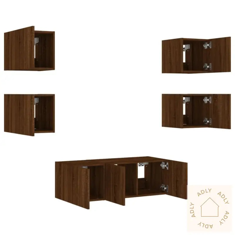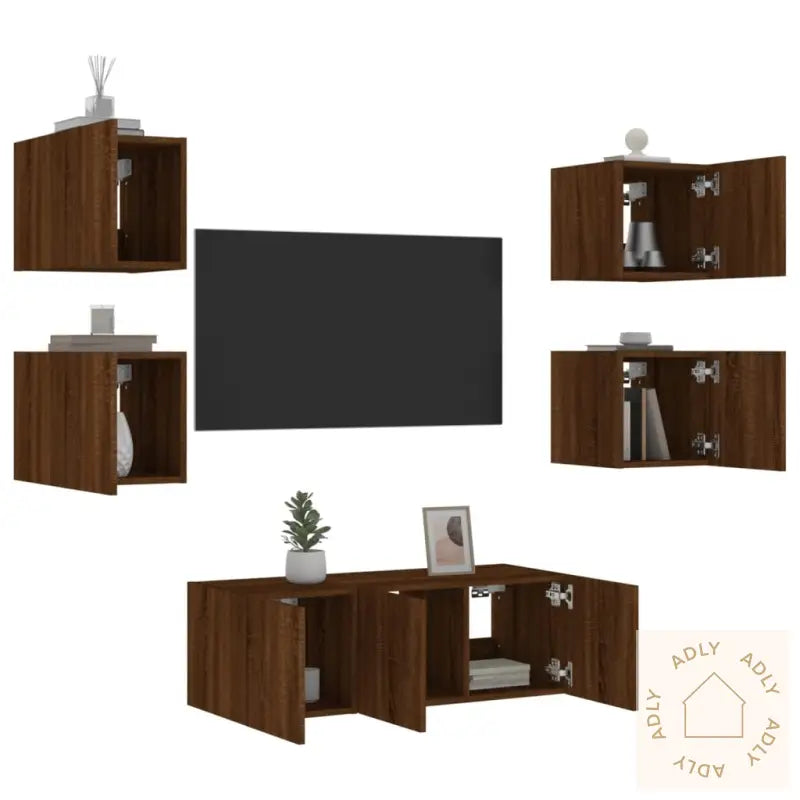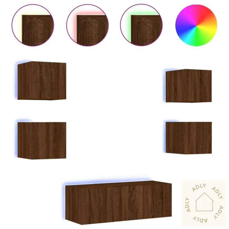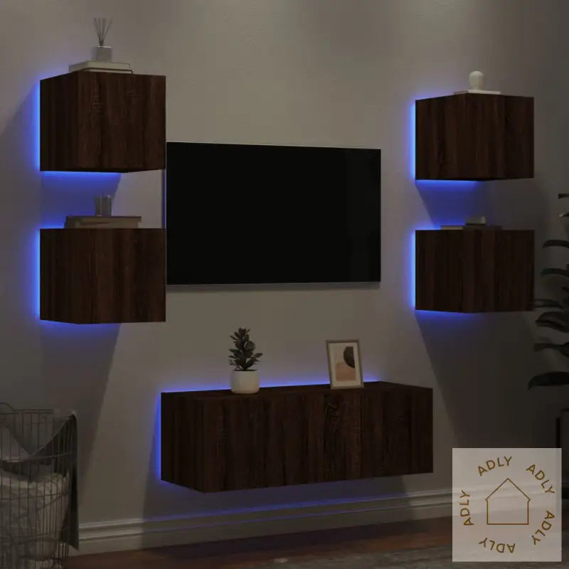 Det konstruerte treverket som er brukt i disse modulene, har en robust konstruksjon og pen finish. Materialet er holdbart og motstandsdyktig mot fuktighet, noe som sikrer lang levetid og stabilitet – perfekt for både små og store familier.Med innebygde RGB LED-lys får du levende belysning og kan enkelt endre stemningen i rommet etter eget ønske. Velg blant forskjellige farger og lysjusteringer med tilpassbare menyer, slik at ditt veggskap ikke bare oppbevarer ting, men også gir et trendy løft til stua eller arbeidsplassen. RGB LED-lysene gjør at veggskapet skiller seg ut og gir møblene et moderne preg.Takket være sitt veggmonterte design frigjør disse TV-enhetene gulvflate, og du kan plassere dem akkurat der de passer best. Det bidrar til å holde rommet mer oversiktlig og gir deg større fleksibilitet når du innreder.Med god lagringsplass bak diskret dører og åpne hyller kan du enkelt organisere bøker, DVD-er, magasiner, medieutstyr og andre småting. Alt har sin faste plass, lett tilgjengelig samtidig som det ser ryddig ut.Enhetene er allsidige og kan brukes både som TV-benk og til oppbevaring på kontoret eller andre steder der du ønsker mer system. De gjør en tom vegg om til en funksjonell og dekorativ del av interiøret, der alt fra verktøy til pynt finner sin plass.Godt å vite: