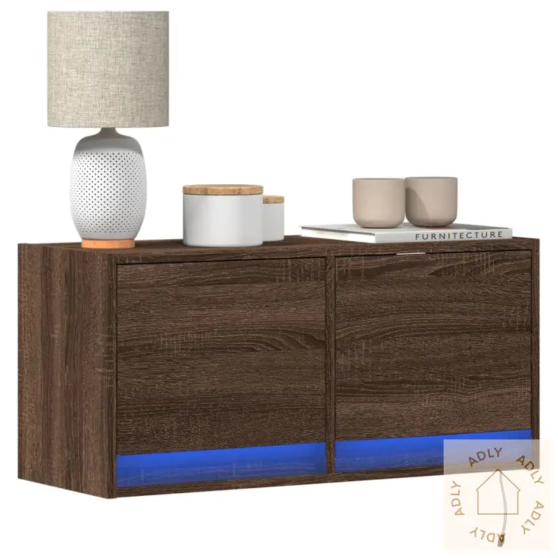 Skruer og plugger til innvendige vegger følger ikke med. Bruk derfor egnet festemateriell for akkurat din veggtype, og kontakt gjerne en fagperson hvis du er usikker. Følg alltid veiledningen nøye for trygg montering.TV-benken har en USB-kontakt. Du trenger en sertifisert 5V USB-strømkilde (ikke inkludert) til LED-lysene.Farge: brun eikMateriale: konstruert treMål: 80 x 31 x 38 cm (L x B x H)Antall skuffer: 2Med LED-lysMontering kreves: ja