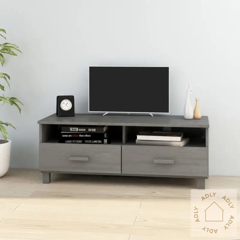 TV-benken har god lagringsplass med to lettglidende skuffer og to åpne rom som gjør det enkelt å organisere multimedieutstyr, bøker eller andre nødvendigheter. Mål skuff gir deg oversikt, slik at du vet at tingene dine alltid får plass. Den robuste bordplaten gir deg mulighet til å stille ut favorittdekor, familiebilder eller grønne planter, noe som skaper et personlig preg på stua. En praktisk spor på baksiden lar deg skjule ledninger og holde området ryddig, så rommet ser alltid velstelt ut.