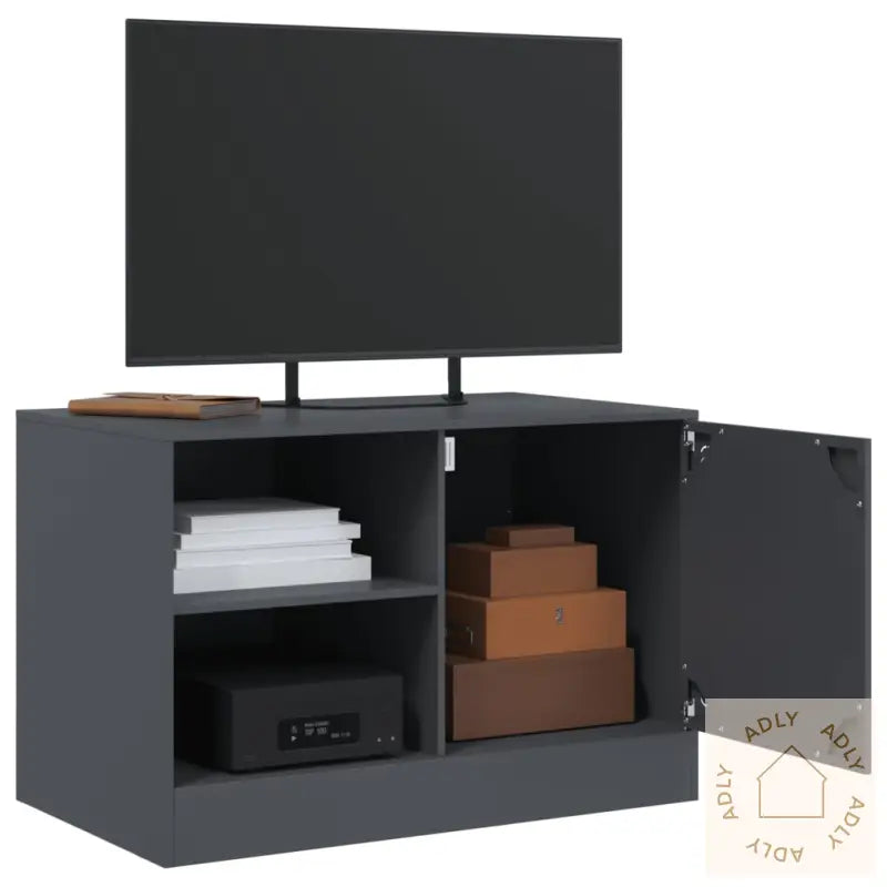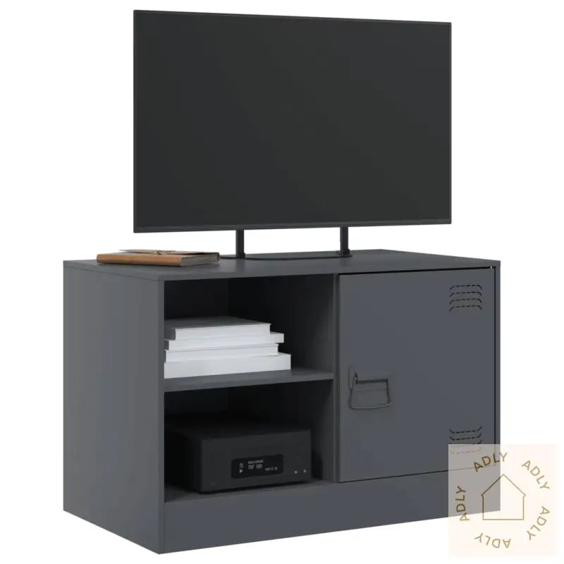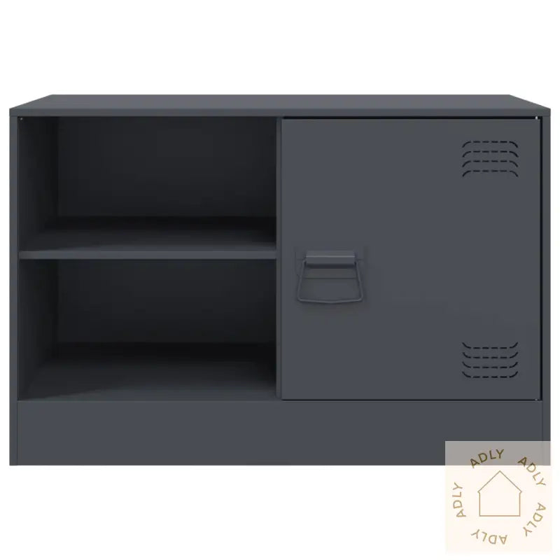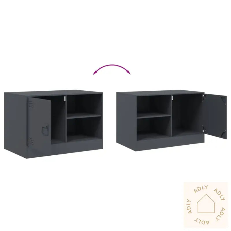 Brukervennlig håndtak: Skapet har et funksjonelt metallhåndtak som gjør det lett å åpne og lukke døren. Dette gir både praktisk bruk og et moderne uttrykk, som passer inn i ulike stiler av møbler til hjemmet.Farge: antrasittMateriale: kaldvalset stålMål: 67 x 39 x 44 cm (B x D x H)Passer til TV-skjermer: 51-76 cmMaks. belastning per benk: 160 kgUtstyrt med 2 hyller1 rom med dør1 metallhåndtakMontering krevesLeveransen inkluderer:2 x TV-benk