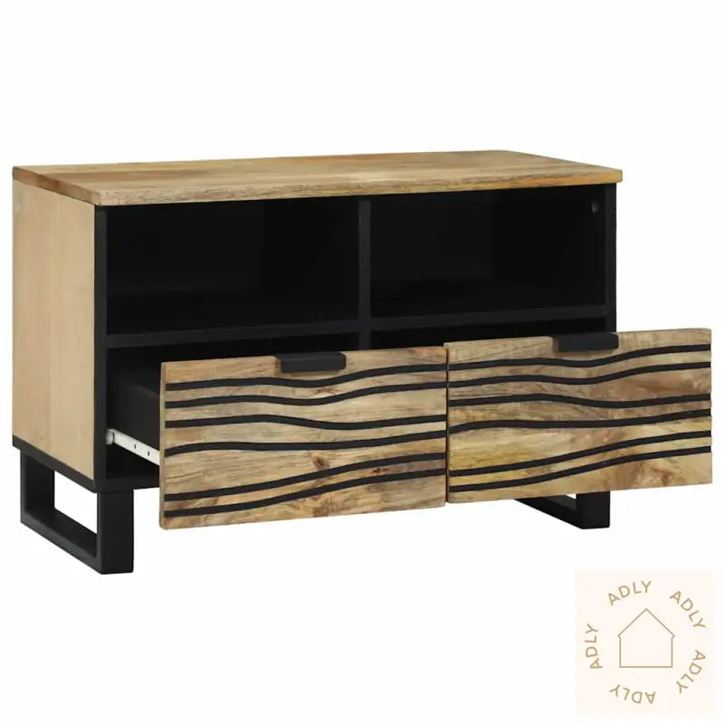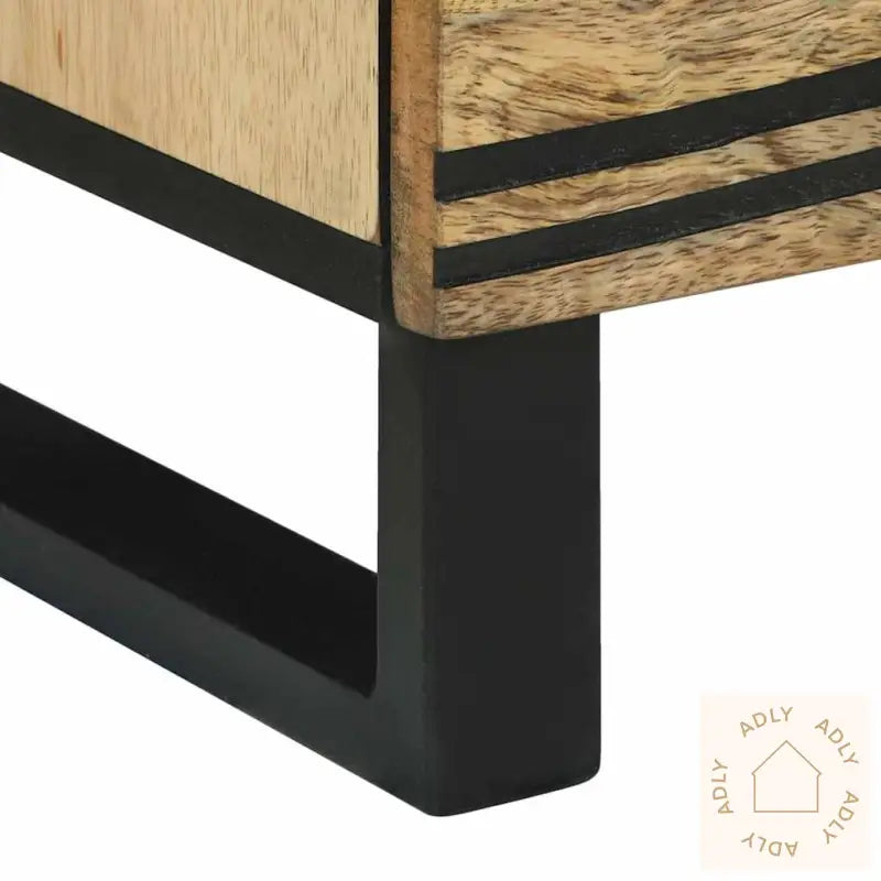 Dette TV-skapet er laget av solid mangotre med en vakker, naturlig finish og stilige svarte metallben. Den moderne kombinasjonen av varme tretoner og sorte detaljer gjør dette til et blikkfang i dagens stuer. Det gir ikke bare særpreg til rommet, men hjelper deg også å holde orden på alt av medieutstyr – både praktisk og pent.
