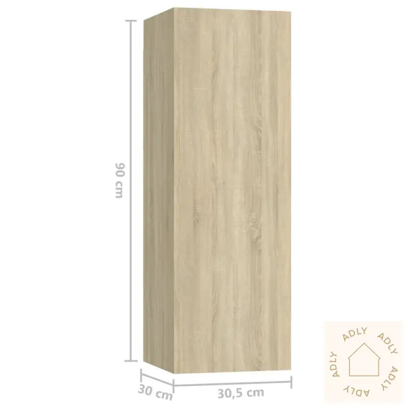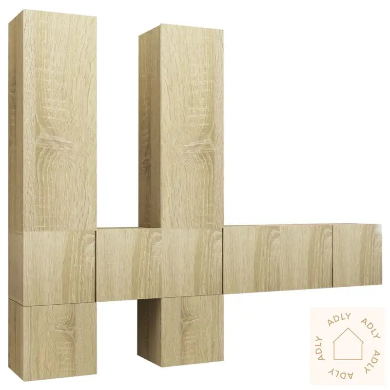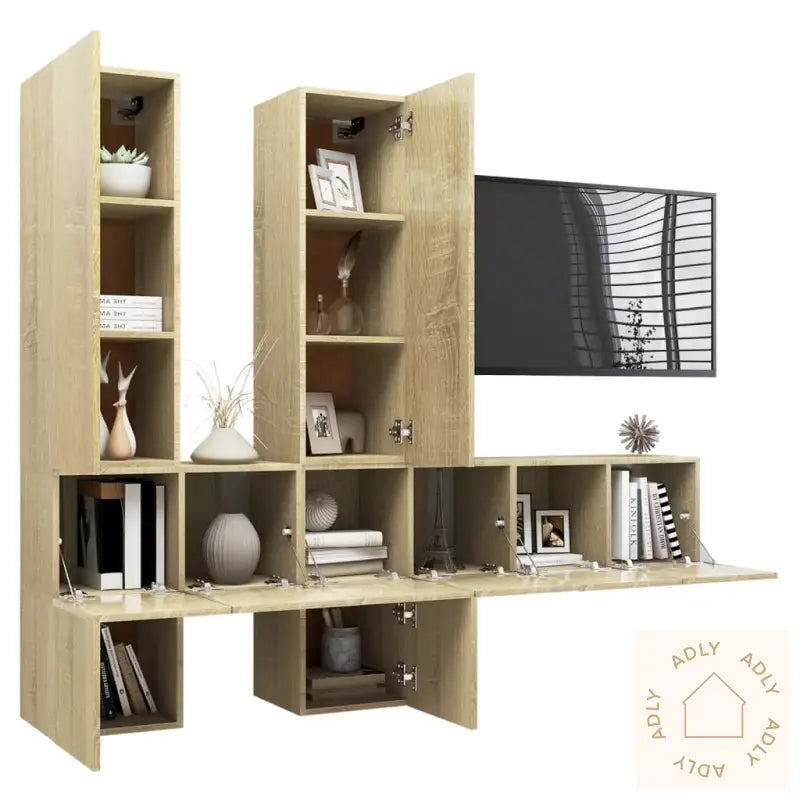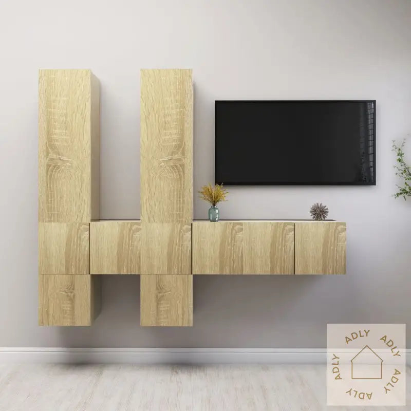 Dette TV-benksettet i den moderne fargen sonoma eik gir et stilrent preg til stuen og blir garantert et blikkfang i hjemmet ditt. Den smarte, veggmonterte løsningen gir ikke bare rikelig med lagringsplass, men sørger også for at gulvet holdes fritt og ryddig.