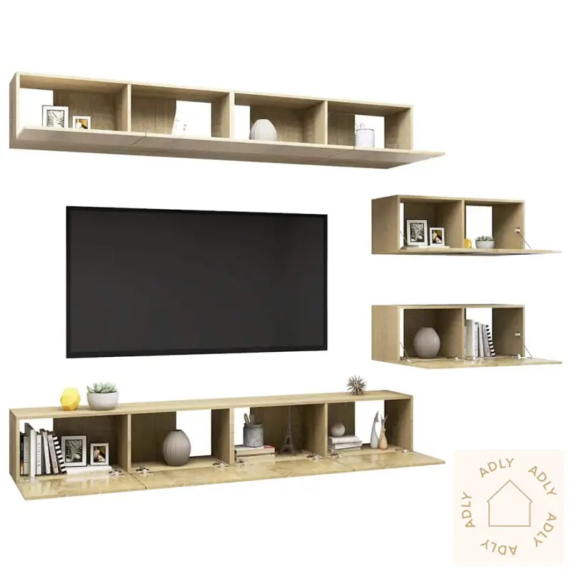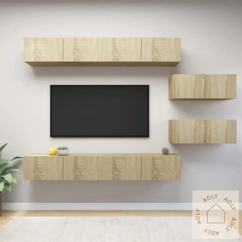 Farge: sonoma eikMateriale: konstruert treMontering kreves: jaLeveransen inneholder:4 x TV-benker: 100 x 30 x 30 cm (B x D x H)2 x TV-skap: 80 x 30 x 30 cm (B x D x H)