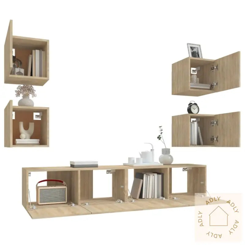 Skrue(r) og plugg(er) for montering i veggen følger ikke med. Finn festemidler som passer din type vegg. Hvis du er i tvil, kontakt fagfolk. Følg instruksjonene nøye når du monterer. Hvert produkt leveres med monteringsveiledning for enkel oppsetting.Farge: Sonoma eik – det tidløse utseendet gir varme og et naturlig preg til hjemmet dittMateriale: Konstruert tre gir ekstra robusthet og lang levetidLeveransen inneholder:2 x TV-skap: 80 x 30 x 30 cm (B x D x H)4 x TV-benker: 30,5 x 30 x 30 cm (B x D x H)