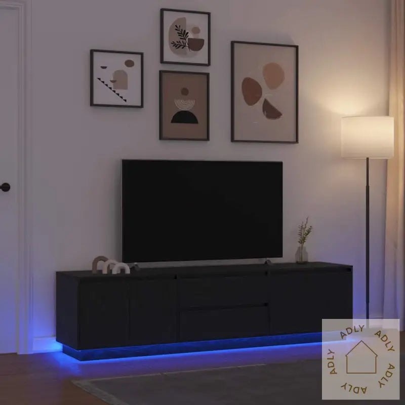 Stabilt og slitesterkt materiale: TV-benken er laget av konstruert tre, noe som gir en robust og stabil struktur. Overflaten er jevn og motstandsdyktig mot fuktighet, vridning og sprekker, så du får et møbel du kan stole på over tid, enten det brukes sammen med andre møbler til hjemmet eller som en kontrast mot for eksempel hagemøbler eller utendørsmøbler i svart eik.Rikelig med oppbevaringsplass: Med to romslige skuffer og fire dører får du masse plass til å organisere magasiner, bøker, DVD-er, multimedieenheter og annet tilbehør. Alt kan lett oppbevares trygt og ryddig, samtidig som det alltid er lett tilgjengelig foran TV-en.RGB LED-lys for stemningsfull belysning: De integrerte LED-lysene lar deg enkelt skape den perfekte atmosfæren til filmkvelder eller andre anledninger. Du kan velge mellom ulike farger, lysstyrker og moduser for å matche stemningen hjemme, og det bidrar til å fremheve den flotte utførelsen i svart eik.Stabil og solid bordplate: Den brede og solide platen tåler vekten av både TV og stereoanlegg uten problemer. Du kan også bruke overflaten til å stille ut dekorative gjenstander som vaser, planter eller bilder.Lettstelt: Materialvalget gjør at benken er veldig enkel å holde ren – bare tørk over med en fuktig klut for å bevare det stilrene utseendet, uten at du trenger mye vedlikehold.Advarsel: