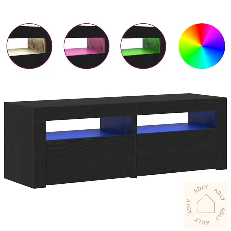 TV-benken har en USB-kontakt til RGB-lysene, så du trenger en 5V USB-strømkilde (følger ikke med).Farge: svart eikMateriale: konstruert treStørrelse totalt: 120 x 35 x 40 cm (B x D x H)Størrelse per seksjon: 60 x 35 x 40 cm (B x D x H)Inndelt med 2 dører og 2 åpne hyllerMontering nødvendig