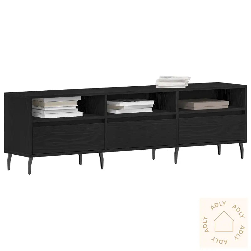 Stilig utseende: Den matte svarte eikefinishen gir en luksuriøs følelse, slik at TV-stativet ikke bare er praktisk, men også fungerer som et elegant blikkfang i stuen din. Svart eik gir et tidløst og sofistikert uttrykk som matcher ulike typer interiør.Rikelig lagringsplass: Du får god plass til både medieenheter, fjernkontroller og pynt takket være tre klassiske skuffer og åpne, flytende hyller. Småting som ellers kunne blitt rot havner enkelt på plass, så du får et mer organisert og ryddig hjem.Solid konstruksjon: Kvalitetstreet og massivt eik sikrer at stativet tåler daglig bruk, med en maksimal vektkapasitet på opptil 50 kg. Dette betyr at du trygt kan sette både store TV-er og annet elektronisk utstyr her – møbelet står stødig og solid.Plassbesparende design: Den rektangulære formen og frittstående stilen gjør stativet ideelt hvis du har mindre plass å jobbe med, samtidig som du likevel får nok flate til både TV og tilbehør. Det gir deg ekstra gulvplass uten å gå på kompromiss med lagringsmuligheter.Allsidig bruk: Dette TV-stativet i svart eik passer ikke bare i stuen – bruk det også til å vise frem kunst, planter eller samleobjekter. Det gjør møbler til hjemmet mer fleksibelt og løfter enkelt uttrykket i ethvert rom, uansett om du har klassisk eller moderne stil.Farge: SvartForm: RektangulærMateriale: Konstruert treFinish: MattInnendørs/Ute: Kun innendørsDeksel inkludert: NeiRom: StueMaksimalvekt: 50 kgMontering inkludert: NeiDimensjoner: 150 x 30 x 44,5 cm (B x D x H)Overflatemål: 3 cmBenhøyde: 10 cmVippe: NeiMerke:Levering inneholder: TV-stativMontering kreves: JaAnbefalt antall personer for montering: 2