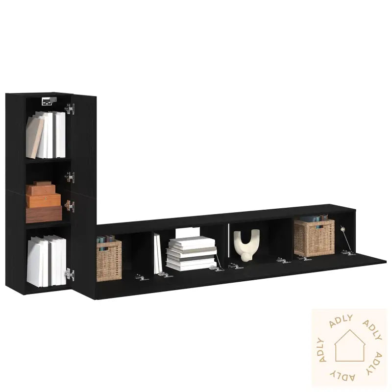 God plass til lagring: Med flere romslige hyller og skap har du muligheten til å organisere alt fra gamingutstyr og DVD-er til pynt og småelektronikk. Det blir enklere å holde stuen ryddig, samtidig som alt er lett tilgjengelig.Tilpassede hyller: De innebygde hyllene er utformet for maksimal fleksibilitet, slik at du kan vise frem samlingen din eller holde favorittingene dine samlet på ett sted.Stilig finish: Svart eik med matt finish gjør møbelet lett å rengjøre og gir det en tidløs look som matcher de fleste interiørstiler. Enten hjemmet ditt går i minimalistisk stil eller blandede dekorvibber, sklir dette inn uten problemer.Allsidig design: Det moderne og rektangulære designet gjør underholdningssenteret egnet for ulike stuer og passer sammen med både klassiske og nyere møbler til hjemmet.Justerbare funksjoner: Justerbare hyller gir deg større frihet til å tilpasse møbelet etter behov, enten det gjelder lagring eller utstilling.Antall produkter: 3Farge: SvartForm: RektangulærMateriale: MDF treFinish: MattInnendørs/Utendørs: InnendørsAntall dører: 3Trekk inkludert: NeiRom: StueHøyde på overflaten: 2 cmSvigninger: NeiMerke: Levering inneholder: Underholdningssenter med lagringMontering nødvendig: JaAnbefalt antall for montering: 2