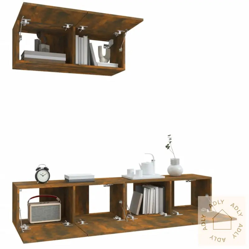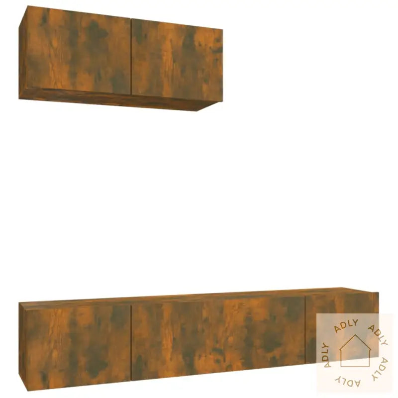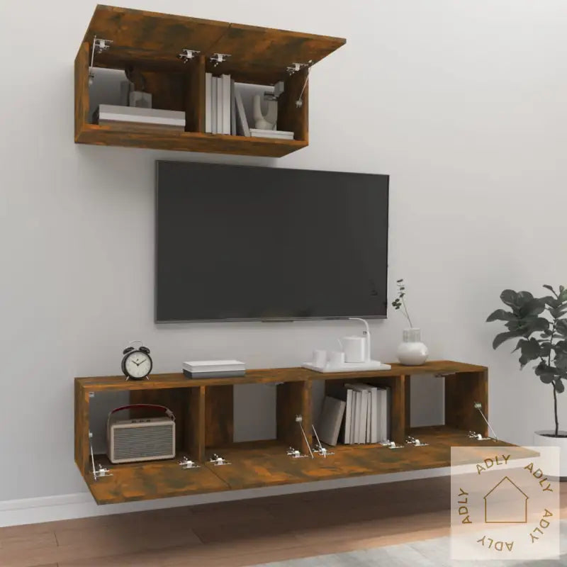 Skruer og plugger til veggmontering er ikke inkludert i pakken. Det er viktig å bruke festemidler som passer til akkurat din veggtype. Ved usikkerhet, spør gjerne fagfolk. Følg instruksjonene nøye for sikker montering av møblene.Alle produktene leveres med en monteringsveiledning i esken, slik at oppsettet går så enkelt og smidig som mulig.Farge: røkt eikMateriale: konstruert treMål (hver): 80 x 30 x 30 cm (L x B x H)Pakken inneholder:3 x TV-benkerDenne stilrene løsningen gir deg både et dekorativt innslag og praktisk oppbevaring sammen med andre møbler – og passer dermed perfekt inn enten du innreder hytten eller hjemmet. Hvis du vurderer kvalitetsmøbler eller ser etter fleksible alternativer til hjemmet, vil dette TV-benksettet være et supert valg. Kombiner gjerne med utendørsmøbler eller hagemøbler for en helhetlig stil gjennom hele boligen.